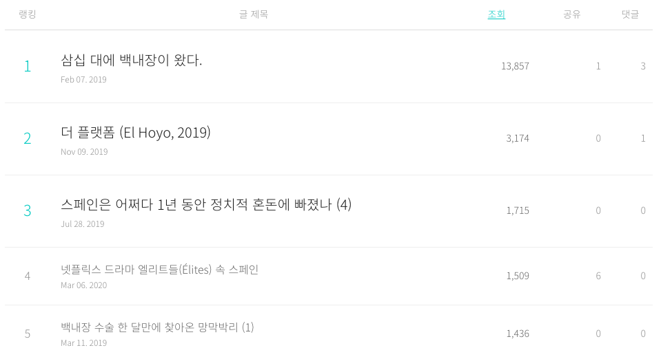 최근은 네 번째에 위치한 스페인 넷플릭스 드라마 '엘리트들' 관련 글을 보러 꾸준히 사람들이 들어오는 편.