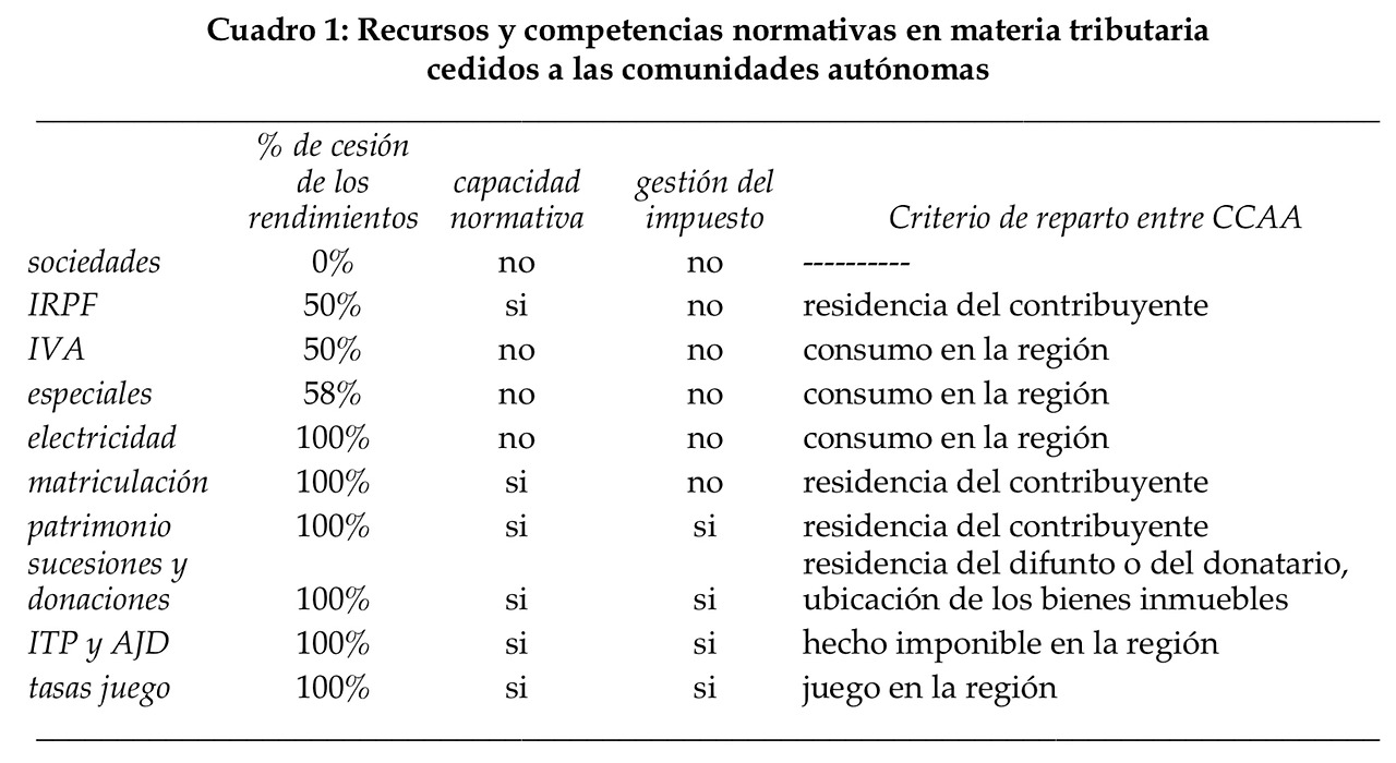 현재 스페인의 예산은 대부분의 국가들과 마찬가지로, 중앙정부가 모든 세수를 추징한 뒤 전체 세입의 전체 혹은 일부를 각 지방의 인구수 혹은 소비 비중에 따라 분배하는 방식을 취하고 있다.