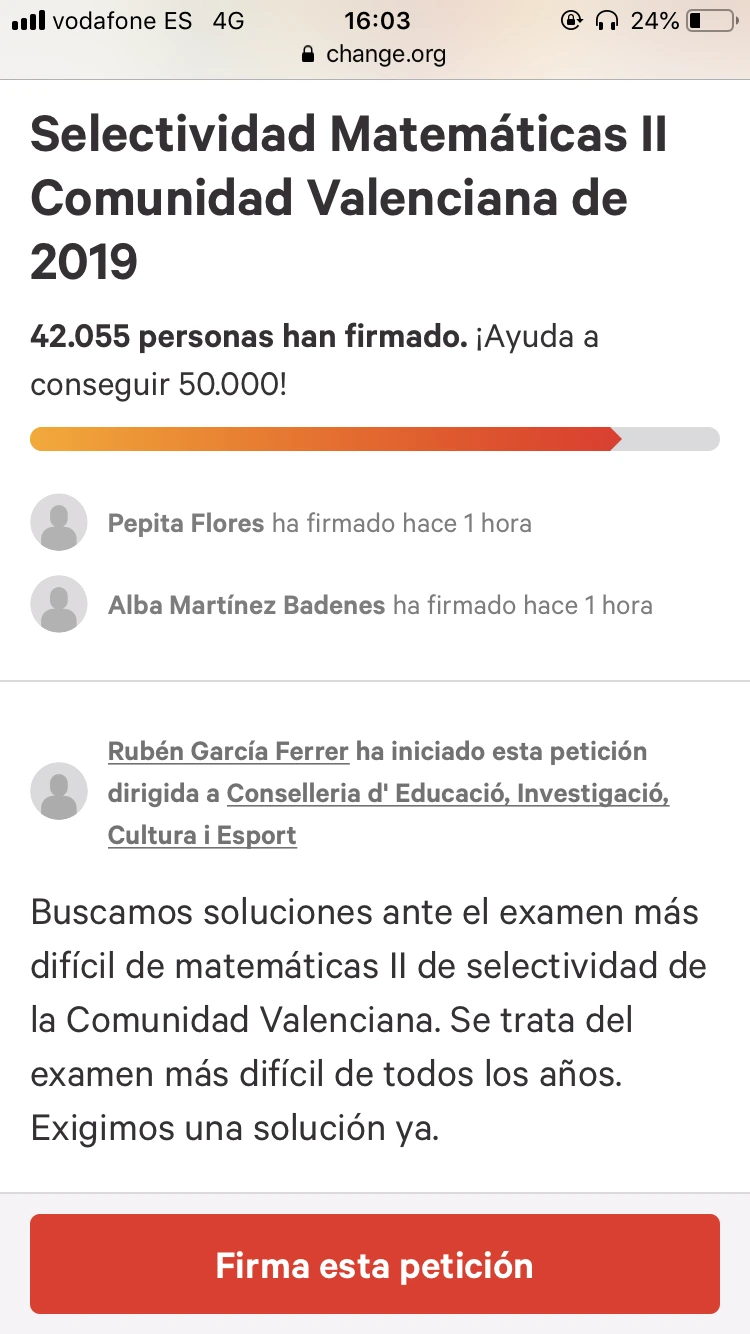 나와는 전혀 관련이 없는 이야기여서 강 건너 불구경 마냥 보고 있었는데, 발렌시아에서 흥미로운 상황이 발생했다. 한 학생이 대입 수학 시험이 작년보다 과도하게 어려우니 이에 대한 대책을 세워달라는 서명운동을 change.org에 올리고 심지어 4만 명 이상이 서명한 것(관련 기사).