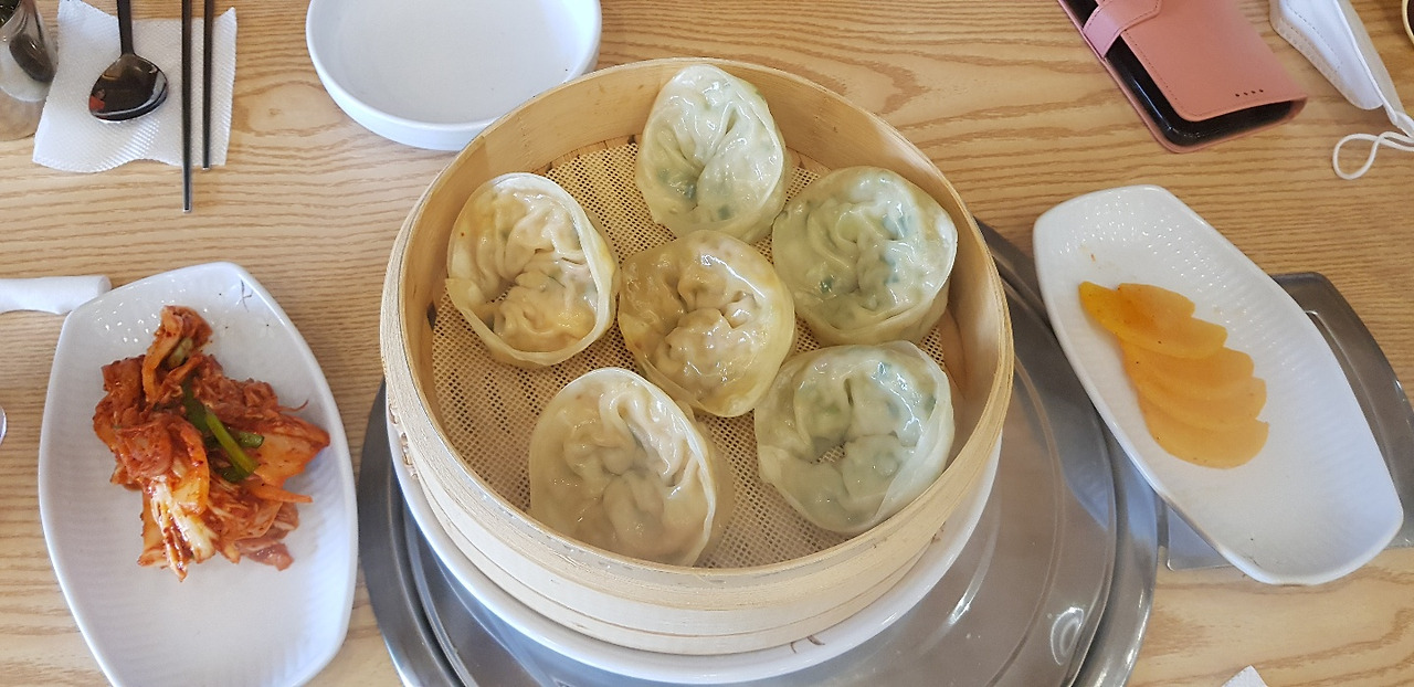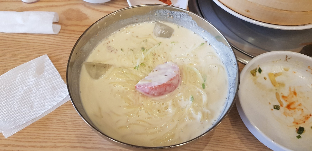 장을 보고 밥을 먹으러 갔지요. 엄마와 저는 시원한 냉면이 먹고 싶었어요. 그런데 마트 옆에 만두집에서 파는 콩국수에 꽂혀 들어갔지요. 콩국수와 만두를 시켜먹었습니다.