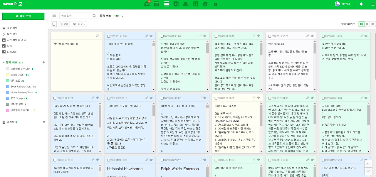 가장 많이 이용하는 네이버 메모. 좋은 구절을 스크랩해두거나, 글쓰기 아이디어가 떠오를 때 바로 남겨둡니다.