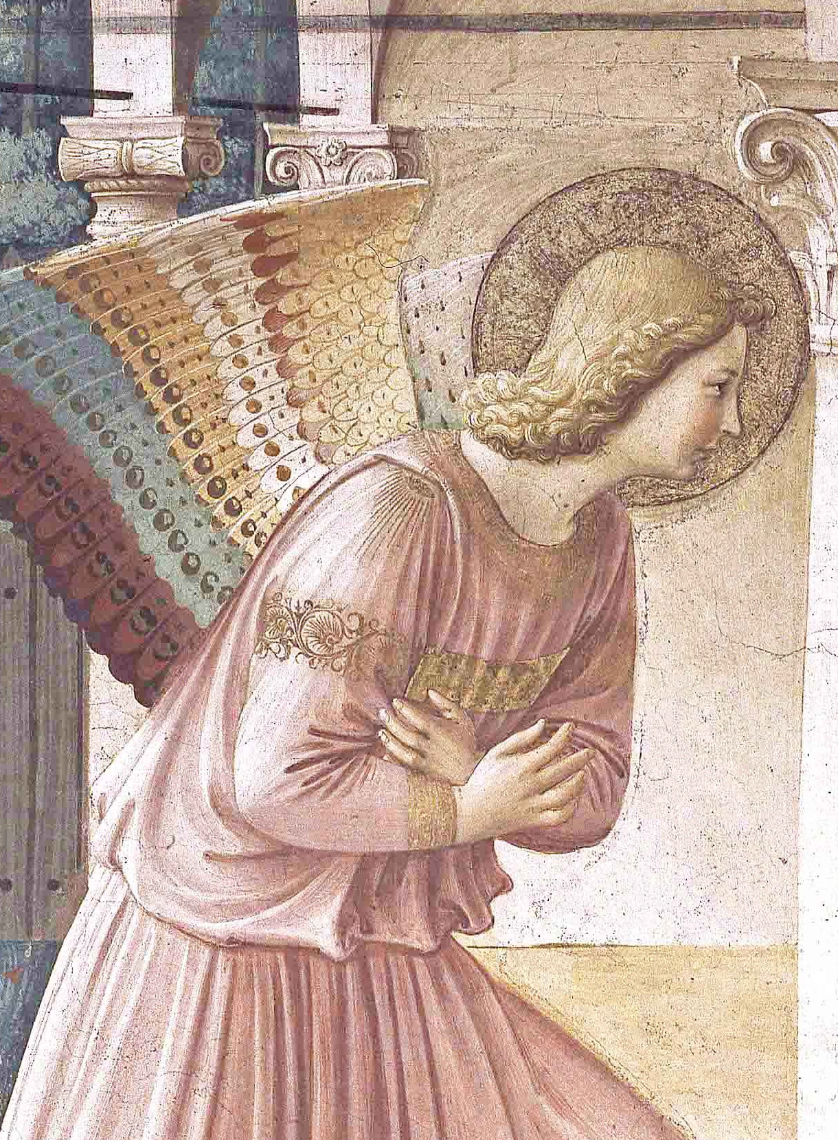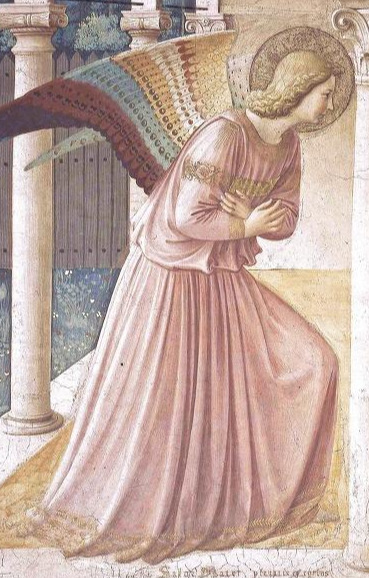 수많은 화가들이 수태고지를 그렸지만 마리아를 진심으로 배려하는 천사의 표정과 행동은 처음이었습니다. 특히나 중세 미술에서 가브리엘은 엄격하거나 무표정한 얼굴을 하고, 기계적으로 명령을 전달하고 있었습니다. 천사는 당사자의 마음은 안중에도 없고, “일이 그렇게 되었으니, 그리 알라.”라고 말하는 듯합니다. 이러한 무뚝뚝한 천사를 안젤리코는 한없이 부드럽고, 따스한 존재로 만들었습니다.