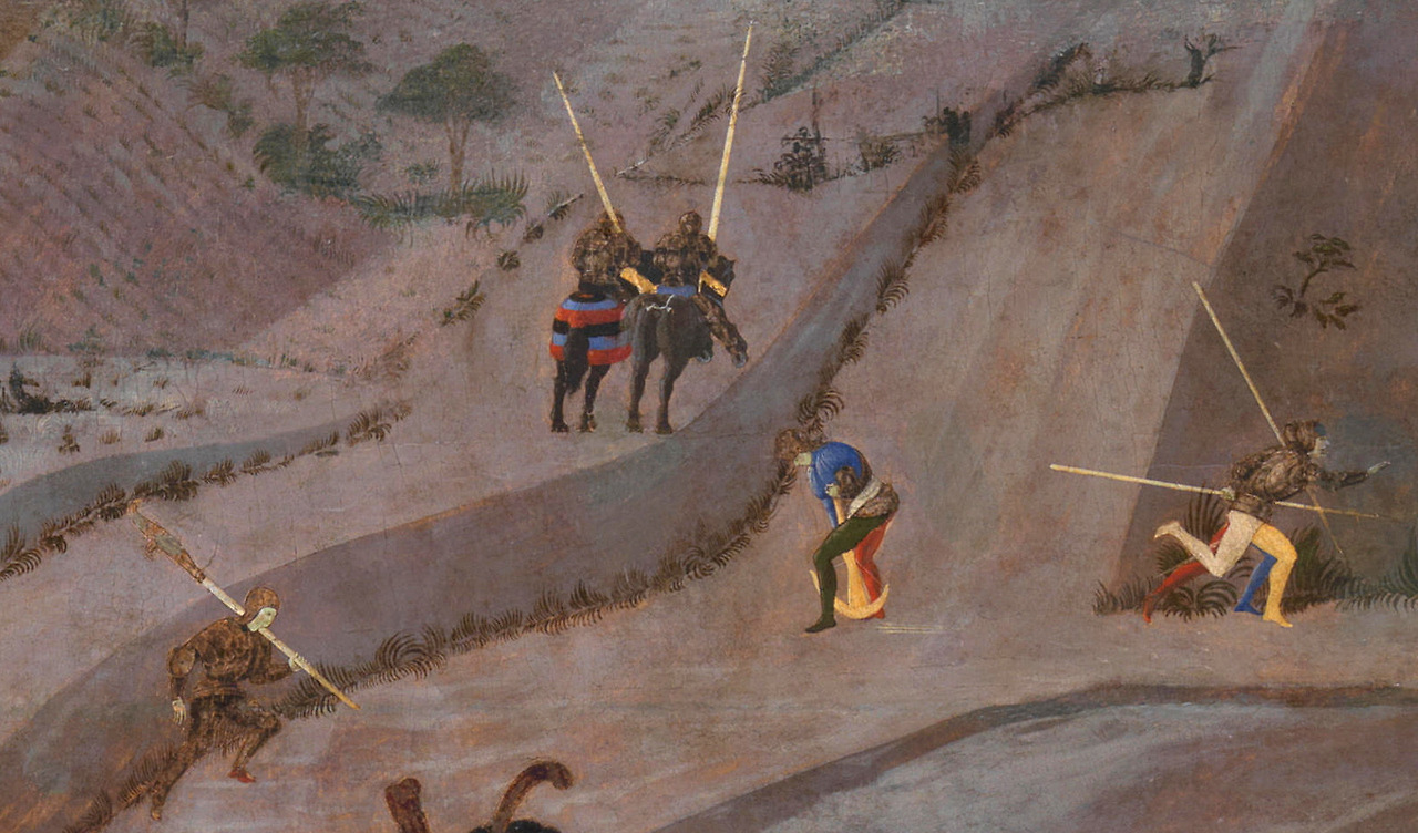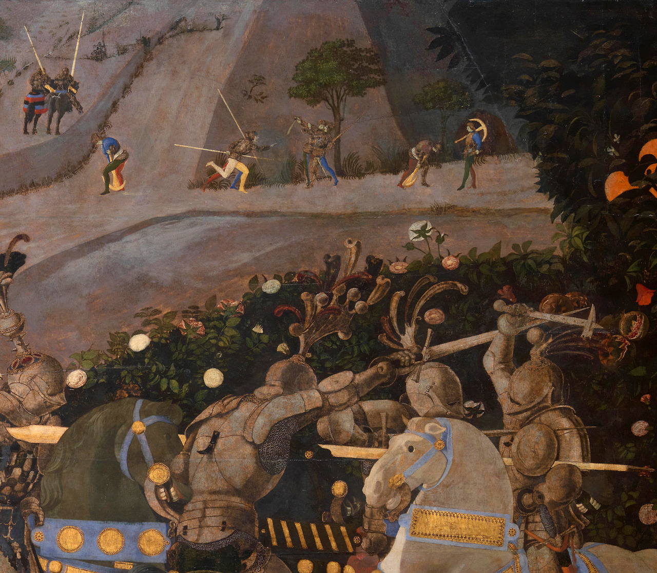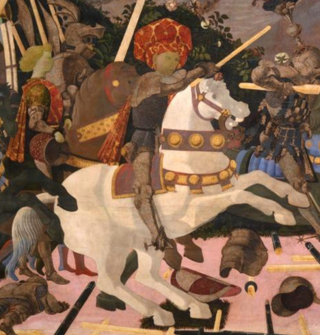 <산 로마노 전투>는 세 개의 대형그림으로 이루어진 연작입니다. 그림은 1423년 피렌체와 시에나 사이에 벌어진 전투를 묘사하고 있습니다. 이 시절 이탈리아에서는 문화적으로 르네상스가 피어나고 있었지만, 도시 국가들은 쉴 틈 없이 서로 싸웠습니다. 그림에 나타난 전투도 그 수많은 전쟁 중 하나이지요.