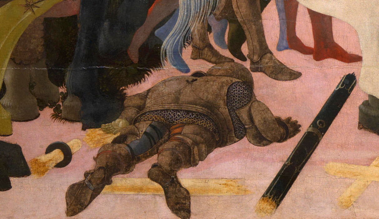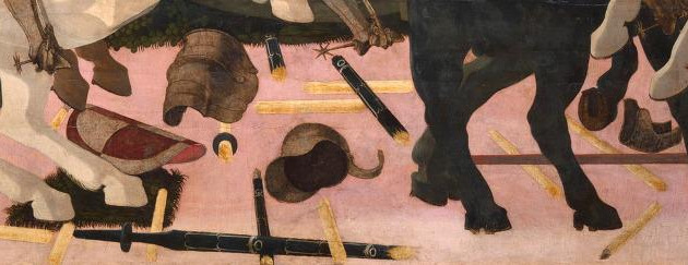 그림의 주인공인 ‘니콜로 다 톨렌티노’로 보이는 사람이 중앙에서 백마를 타고 군대를 지휘하고 있습니다. 그 뒤로는 싸울 태세를 갖춘 창을 든 피렌체 병사들이 보입니다. 화면 오른쪽에서는 이미 피렌체 군과 시에나 군이 한창 싸우고 있네요. 바닥에는 온갖 부서진 창, 투구, 갑옷 등 장비들이 떨어져 있고, 말의 발밑으로 쓰러진 시체가 있습니다. 그런데 그림은 분명 ‘전쟁’을 보여주고 있지만, 화면은 이상하리만치 ‘정적’입니다.