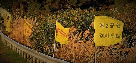 흡사 달동네 철거지역을 지나는 것처럼 일대의 큰 도로가에는 결사반대 구호들의 깃발이 마지막 꽃샘바람에 펄럭이며 도열해 있다.