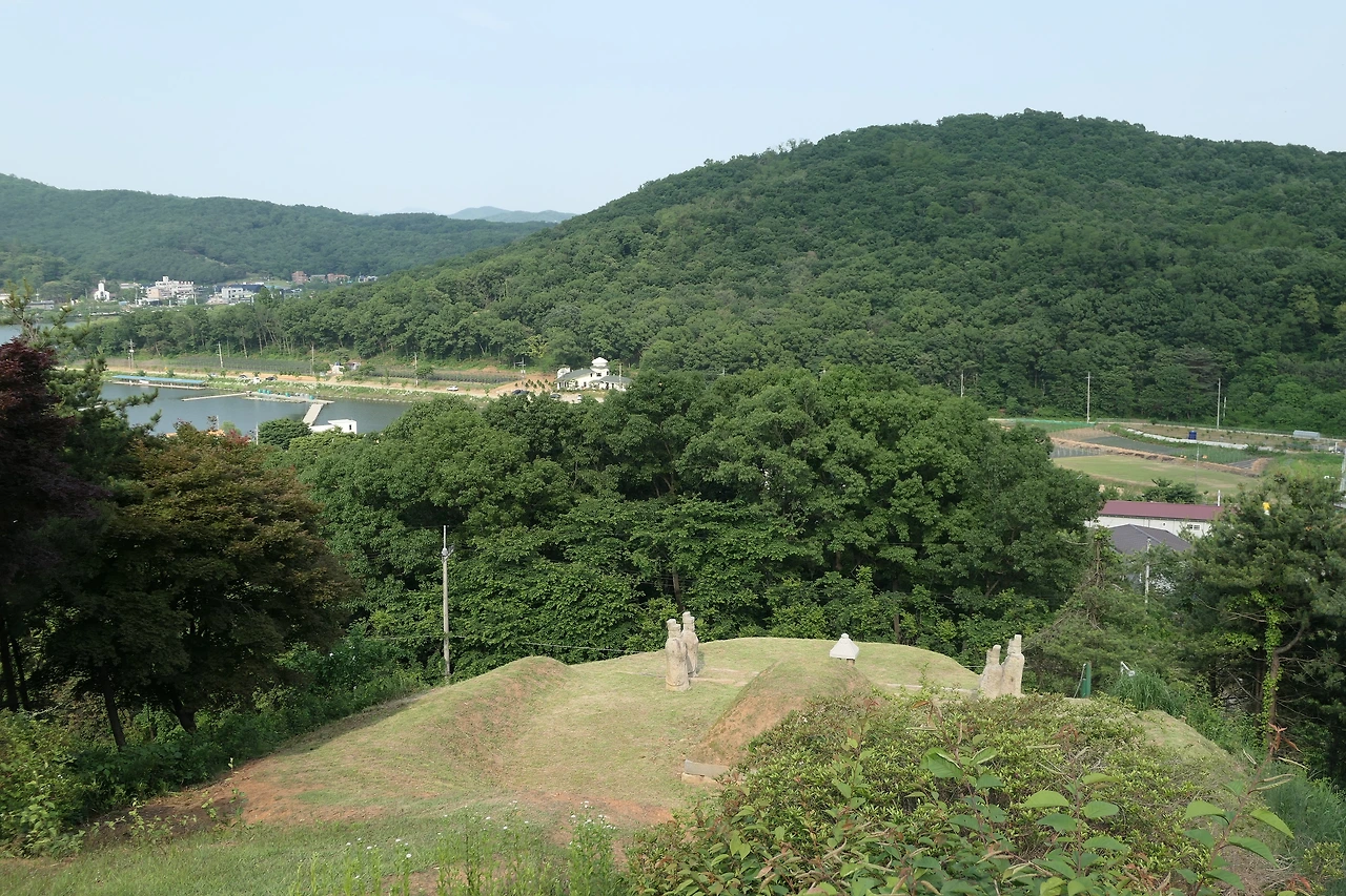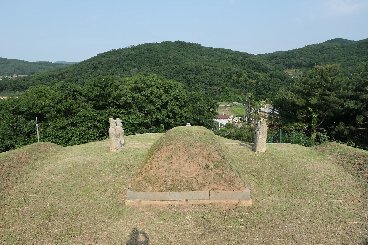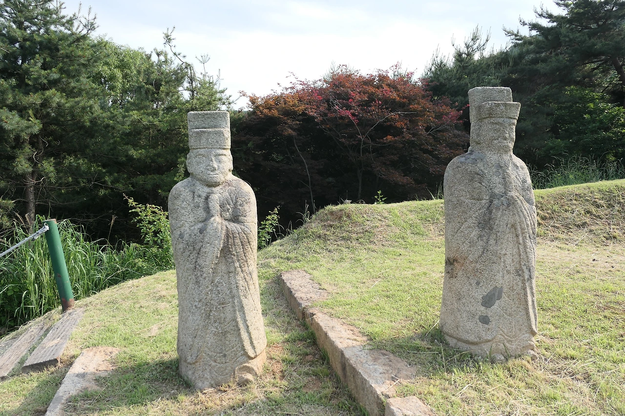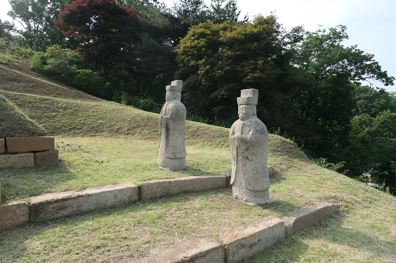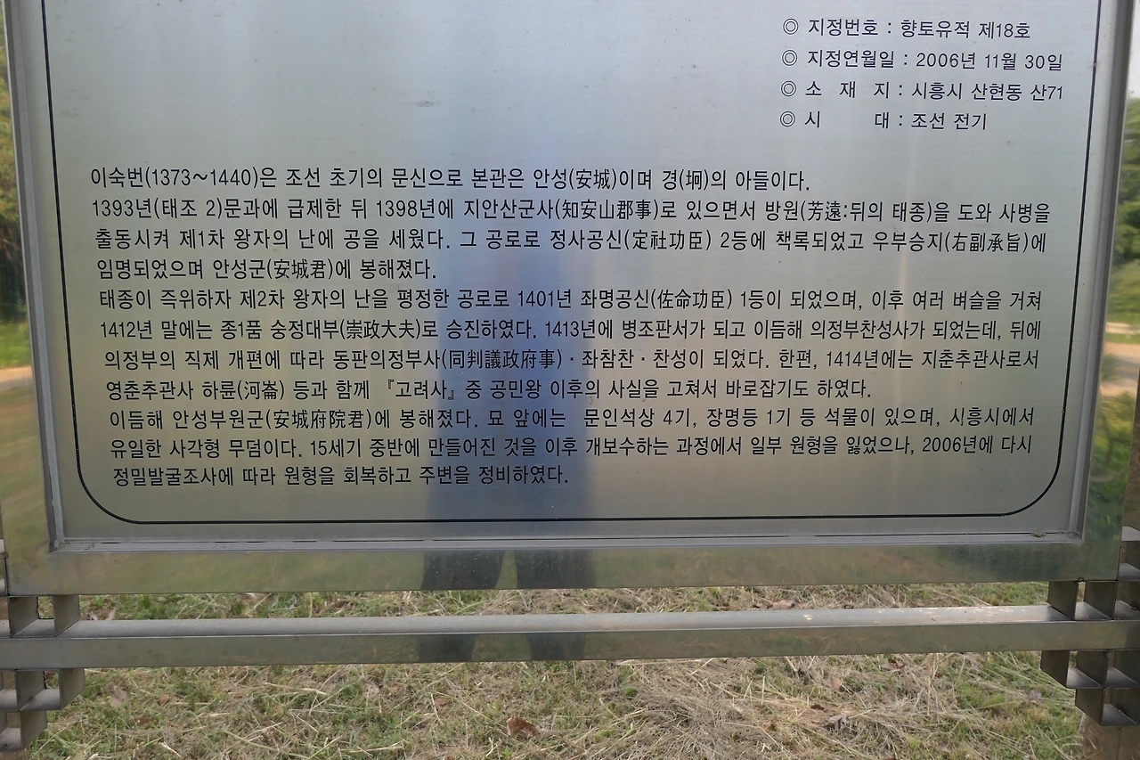 이숙번의 재실이 있는 건물 앞마당을 쇠줄로 출입을 막아 놓은 탓에 주차할 만한 곳이 마땅치 않았다. 탐방을 위한 기반시설 없이 향토유적지 표지판만 세워 놓은 것이다. 할 수 없이 그곳을 지나쳐 물왕 저수지로 내려가는 길이 있는 삼거리 근처에 차를 세웠다. 차에서 내리자 달궈진 아스팥트에서 열기가 후끈 올라왔다. 열기가 사그라질 만한 늦은 오후였지만 유월의 해는 여름을 향해 달리고 있었다. 길옆에 있는 신도비 옆으로 가파른 나무계단이 보였다. 천천히 올라갔다. 오른쪽으로 걸음을 돌리자 무덤과 문인석이 나타났다. 화려하지도 초라하지도 않았다. 이숙번의 무덤 뒤로 늘어선 세 개의 무덤도 보였다. 향토유적지로 지정되면서 후손들이 이숙번의 조상 묘도 함께 정비했다.