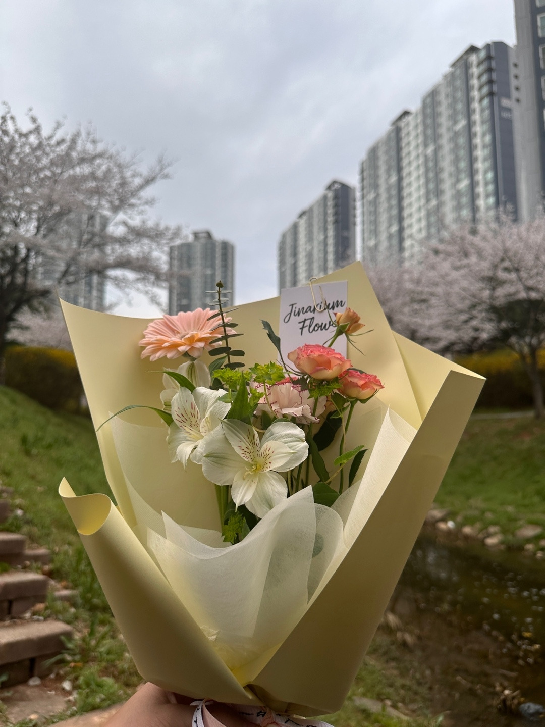 오는 길에 나란히 서있는 벚꽃들이 너무 이뻐 벚꽃을 배경으로 이 꽃다발과 함께 사진을 찍었다.