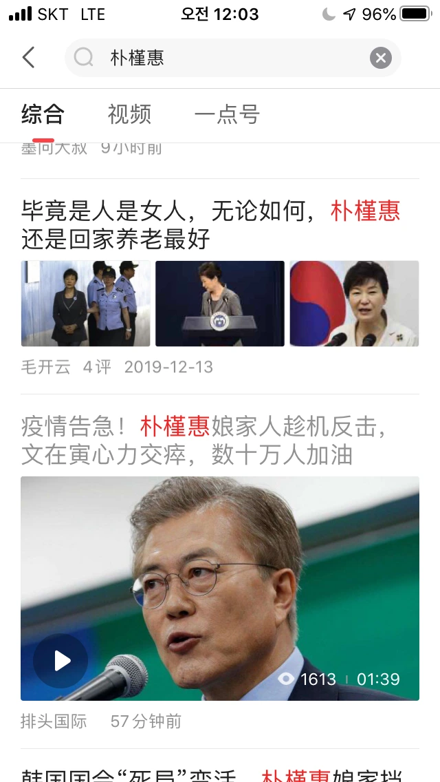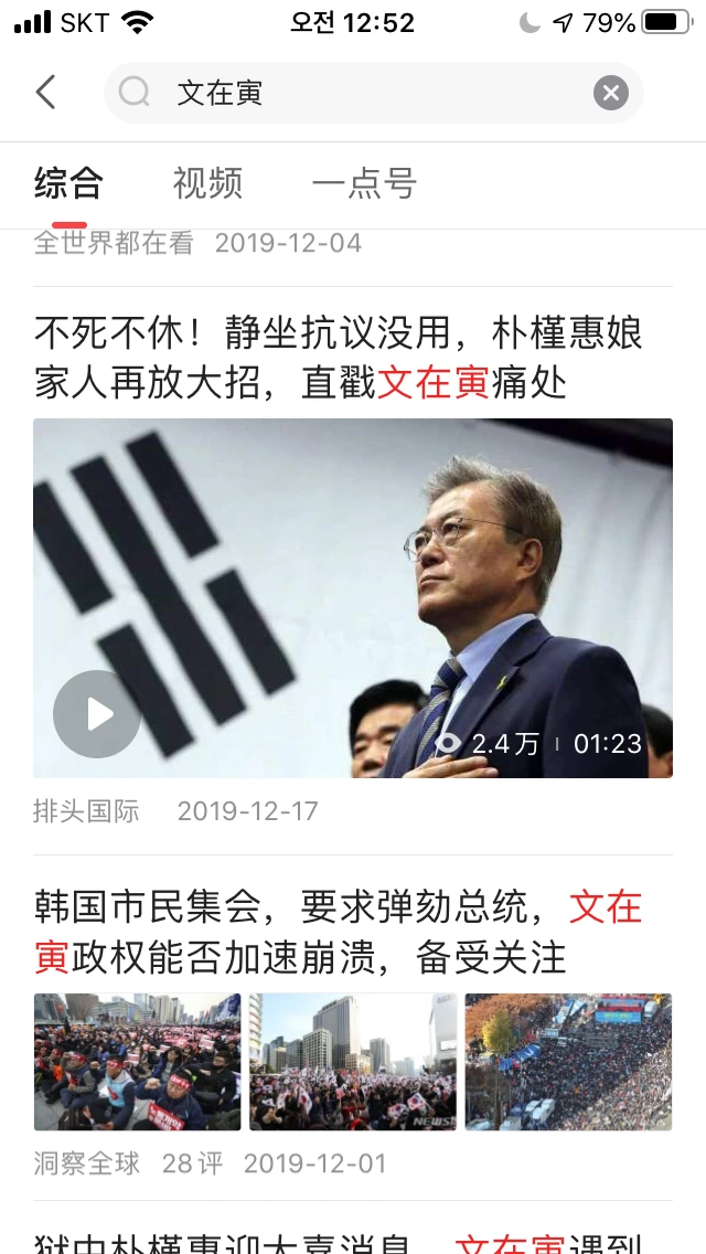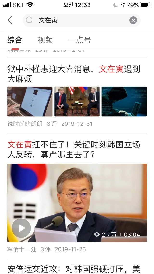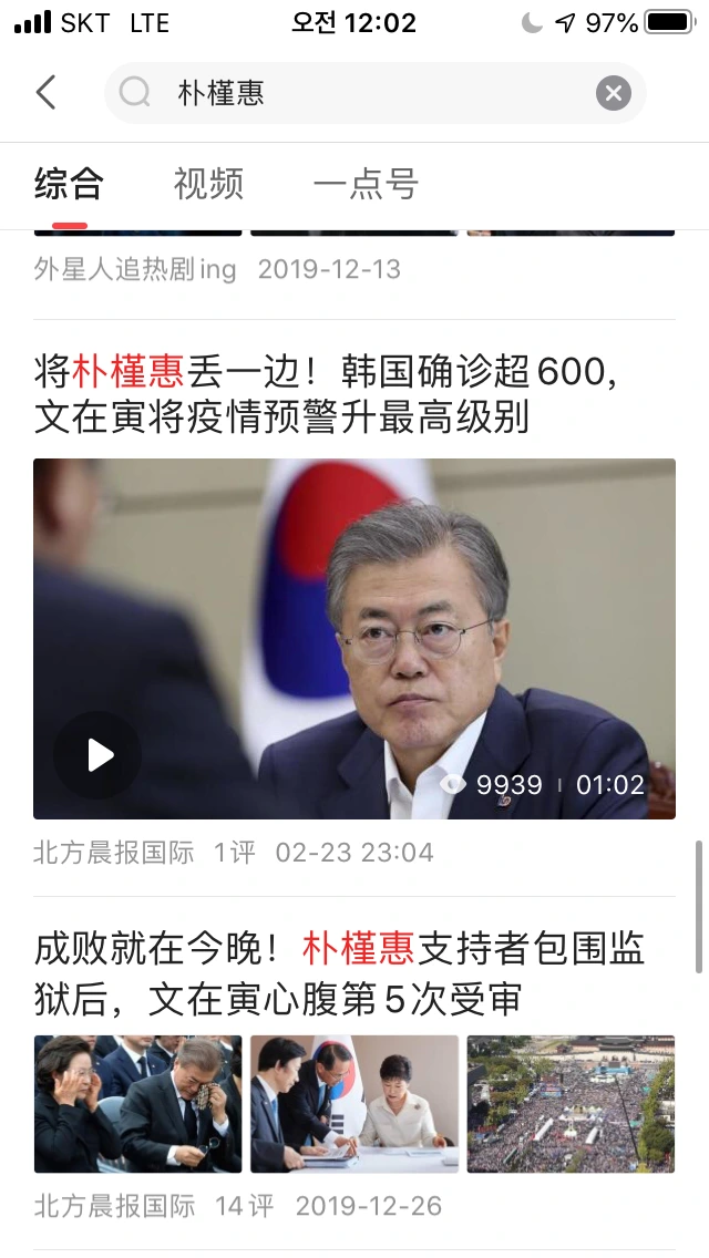 중국 미디어 앱인 <一点资讯>에서 문재인으로 검색하면 한국의 태극기 부대가 썼을 법한 글들이 참 많이 올라온다. 예컨대 문재인은 박근혜에게 누명을 씌워 감옥에 보냈으니, 그가 대통령 자리에서 물러난 순간에도 끝이 좋지 못할 것이라는 둥, 박근혜가 감옥에서 지하의 수족들을 부려 문재인에게 반격할 것이라는 둥의 글들이 올라온다. 다들 알다시피, 중국 언론은 중공에서 철저하게 관리하기 때문에, 이런 글들 역시 중공의 이익에 반하면 가차없이 삭제될 것이다. 하지만 그런 일은 본 적이 없다. 따라서 이는 중공에서 문재인을 어떻게 바라보고 있는지를 간접적으로 보여주고 있다고 생각한다.
