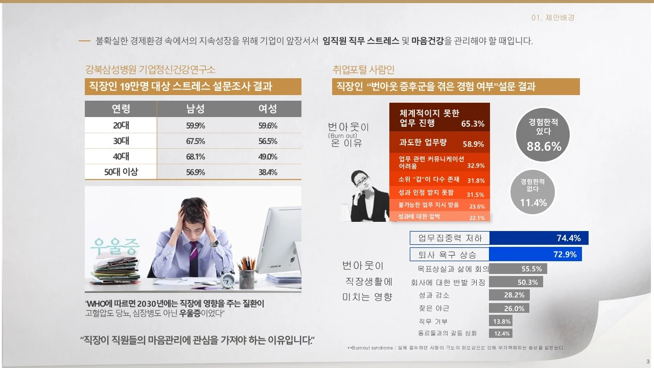 비단 나만 그런 건 아닌 것 같다. 강북삼성병원 기업정신건강연구소에서 19만 명의 직장인을 대상으로 스트레스 설문조사를 한 결과, 놀랍게도 88.6%가 번아웃을 경험한 적이 있다고 답했다. 번아웃이 오는 이유는 2가지로 요약된다. 과도한 업무와 직장 내 대인관계. 나로서는 예측할 수 없는 야근과 주말 근무, '도대체 이런 일을 왜?'로 시작하는 자잘한 업무의 증식과 팀원의 절반을 내보낸 팀장이 그 원인이었겠다.