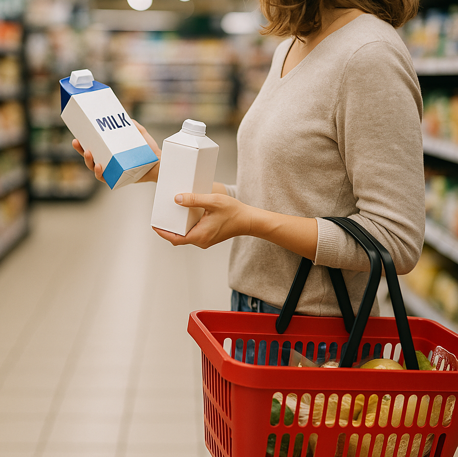 조금 더 저렴한 우유를 조심스레 카트에 담는다.