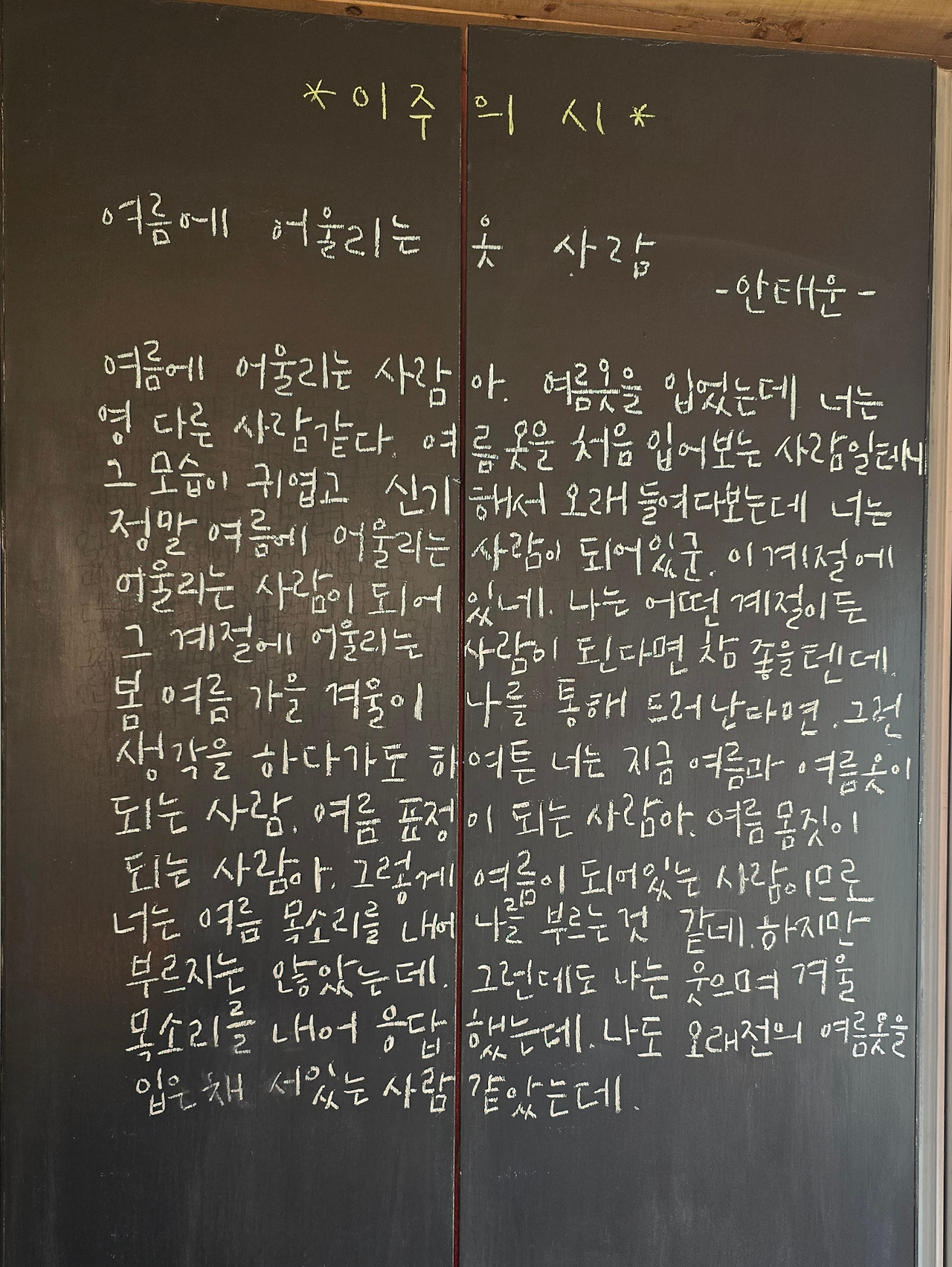 입구 한쪽 칠판에는 이주의 시로 안태운의 『여름에 어울리는 옷 사람』이라는 시가 정갈한 글씨체로 빼곡히 적혀있었다.