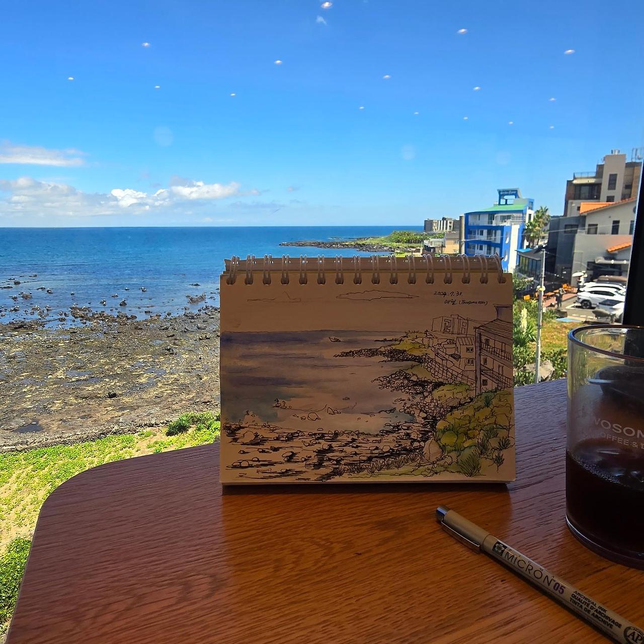 아침 10시, 제주 바다를 보며 호사스럽게 스케치북을 꺼내 그림을 그리며 친구와 수다를 떨고 있는 내 모습이 신기했다.