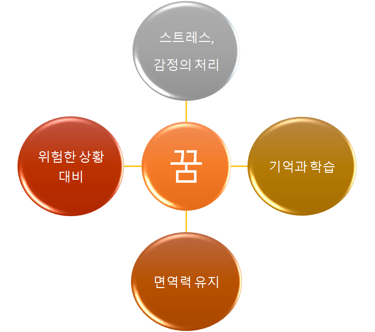 그 외에도 꿈은 우리의 면역력이 잘 유지될 수 있도록 돕고, 악몽을 통해 위험한 상황에 미리 대처할 수 있도록 예행 연습을 하는 등 우리의 원활한 일상 생활에 매우 중요한 역할을 합니다.