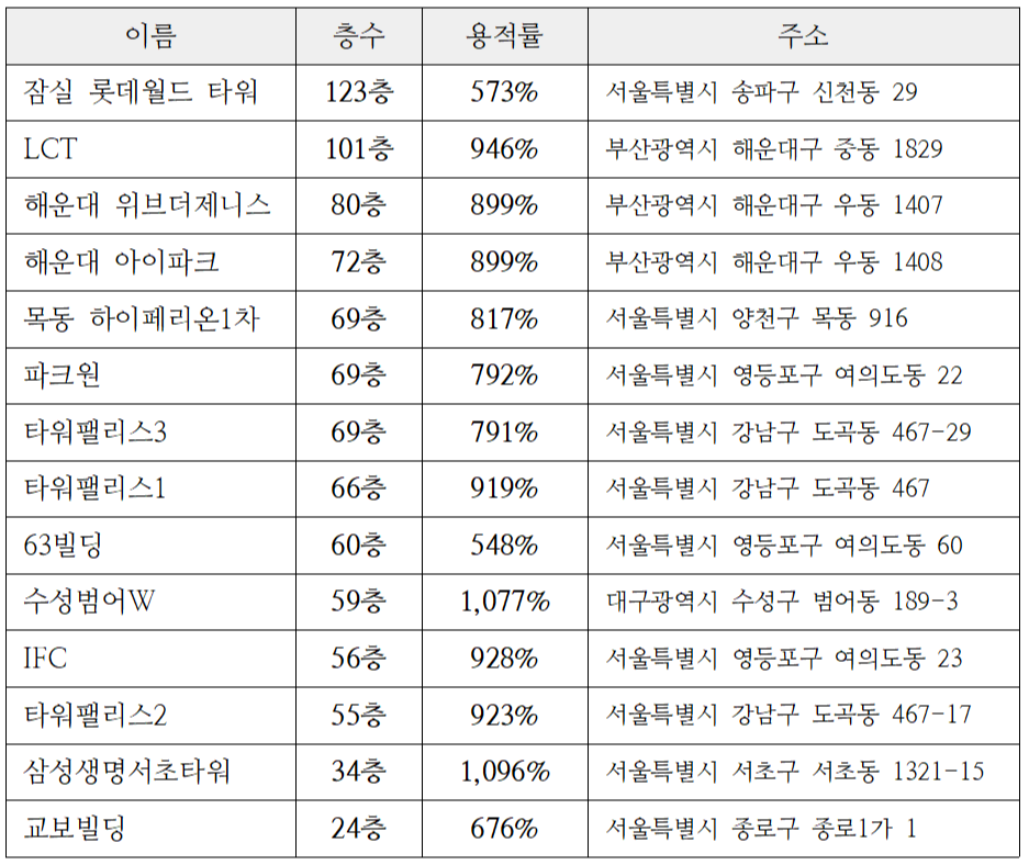 “좋은 접근이야. 고층 건물일수록 용적률이 높은 건 사실이야. '일반적'으로는 말이지. 이참에 한국 대표 고층건물들의 용적률을 살펴볼까? 자, 삼촌이 마침 이렇게 표를 만들어 주머니에 넣어 왔단다.”