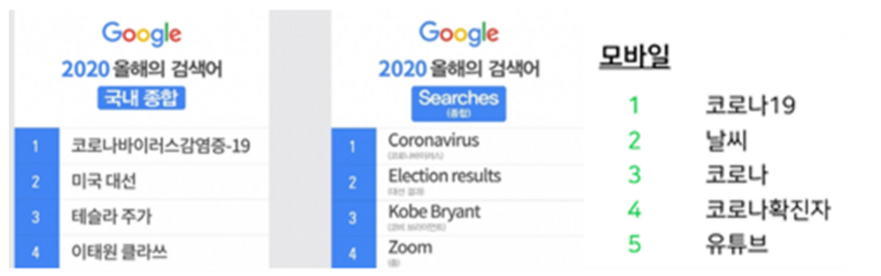 “틀렸지만 좋은 접근이네. 정답은 ‘코로나’였대. 세계 1위 포털인 구글에서도, 한국 1위 검색 포털에서도 2020년 기준 연간 검색어 1위였다더라.”