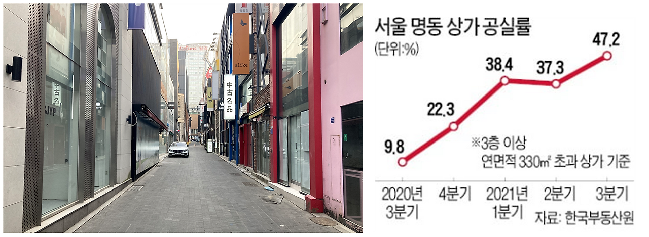 “작은 집은 여전히 인기가 좋지. 그간 인기가 주춤했던 큰 집의 수요가 어느 정도 회복되었다고 이해하면 돼. 바이러스의 확산은 집뿐만 아니라 상권에도 영향을 미쳤어. 사람들이 해외여행을 떠나지 못하게 되면서 외국인 관광객들에게 인기가 많던 명동 같은 관광 상권지의 공실이 급증한 거야. 물론, 여행 상권만 타격을 받은 게 아니었단다. 집합 금지 명령에 따른 인원수 제한, 영업시간제한 등으로 동네 식당을 비롯한 가두 상권들도 큰 타격을 받고 공실 상가가 늘어났지.”