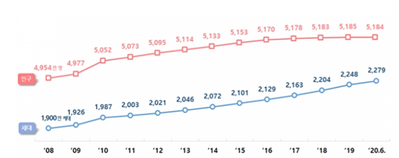 “과연 그럴까? 대한민국의 인구는 2010년에 5천만 명을 돌파한 이래 완만하게 증가하다 최근에는 변곡점을 지나 감소가 시작되고 있는 상황이야. 그럼에도 세대수는 꽤나 늘었단다. 2014년부터 2021년까지 약 1,987만 세대에서 2,279만 세대로 약 14.7% 증가했어. 서울만 따로 떼어내 살펴봐도 마찬가지야. 해당 기간에 인구는 5.56% 감소했는데, 세대수는 오히려 5.1% 증가했거든.”