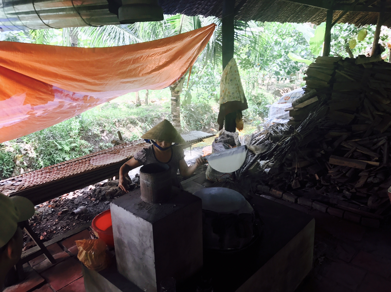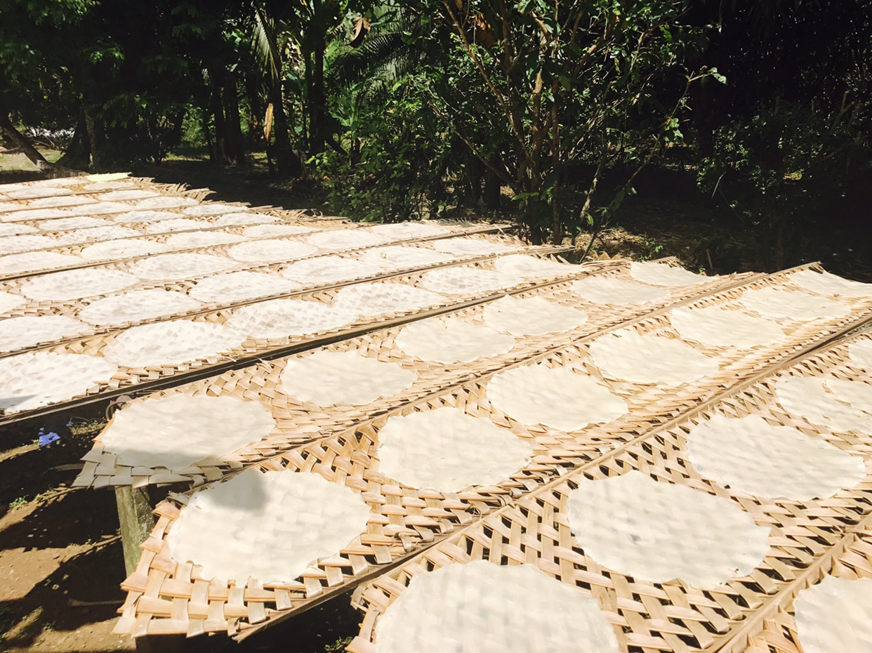 버스에서 내려 큰 배로 갈아탔다. 메콩강 한 가운데로 나아가는 순간, 메콩강에 왔다는 것이 실감났다. 메콩강 한 가운데를 가로질러 어디론가 갔다. 처음 향한 섬에서는 라이스페이퍼를 만드는 모습을 봤다. 왔으니 사는 시간. 코코넛칩을 하나 사들고 가이드를 따라갔다. 다음은 코코넛으로 만든 다양한 도구를 파는 곳이었다. 더위에 지쳐 베트남 전통 모자 하나를 사고, 코코넛 젓가락과 숟가락 그리고 코코넛 그릇을 하나 샀다. 투어하면 역시 쇼핑이다. 강매하는 건 아니라 사고 싶은 것만 알아서 산다.