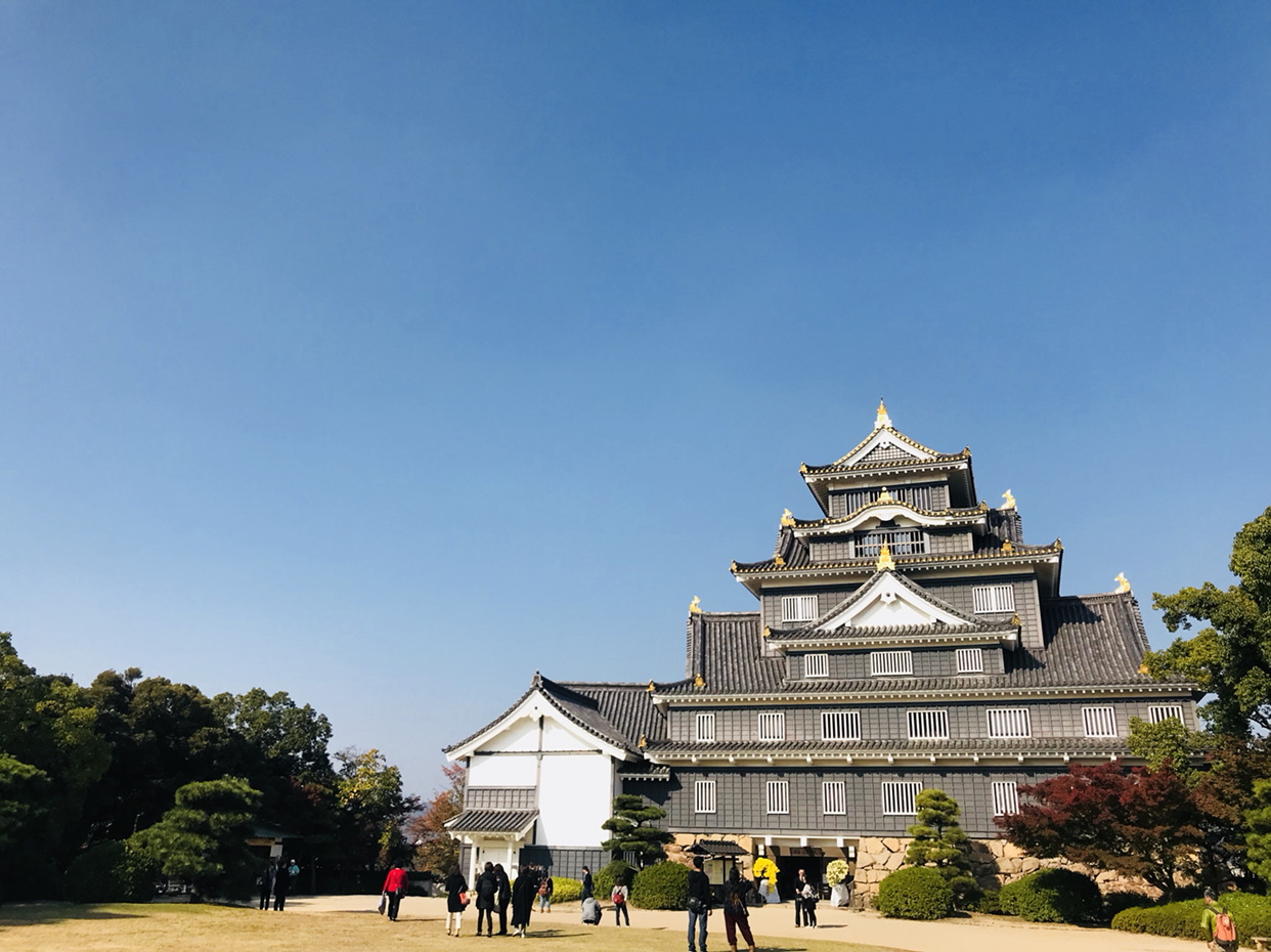 오카야마성은 까마귀성이라고 불리기도 합니다. 백로인 히메지와 정반대이지요. 까마귀성이라는 이름에 맞게 까마귀가 몇 마리 돌아다니고, 성의 외관은 검은색입니다. 히메지성을 재밌게 둘러본 터라 많이 기대하고 갔습니다만, 생각보다 작은 규모이고, 현대에 들어 다시 복원한 성이라 조금 실망했습니다. 이렇게 두 성을 다 가보니 히메지성이 정말 대단한 성이라는 사실을 느끼게 되었습니다.