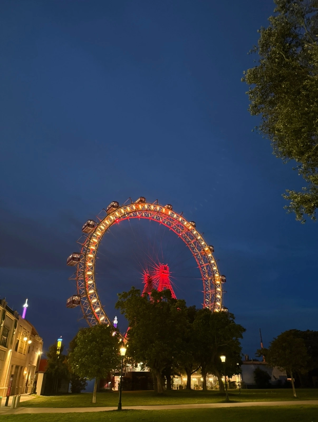 저녁을 배부르게 먹고 다시 트램을 타고 프라타 놀이공원으로 향했다. 우리나라의 놀이공원과는 다르게 입장료 없이 누구나 들어가고 놀이기구 타는 사람만 비용을 지불하는 구조로 되어 있는 놀이공원이었다. 여기도 빈 하면 떠오르는 영화에 나온 대관람차가 유명한 곳이었지만 굳이 타는 것보다 대관람차를 배경으로 놀이공원을 구경하는 것이 더 좋아 대관람차를 타지는 않았다. 비싼 티켓값도 한 몫했고. 놀이공원은 굉장히 넓었고 평일 저녁임에도 불구하고 사람들이 굉장히 많았다. 내가 타는 것보다 남이 타는 것을 구경하는 재미가 쏠쏠했다. 날이 어둑어둑해지자 여기저기 불이 들어와 예쁜 풍경을 만들어주었다. 돌아가는 길에 마지막으로 대관람차를 배경으로 한 야경을 감상했다.