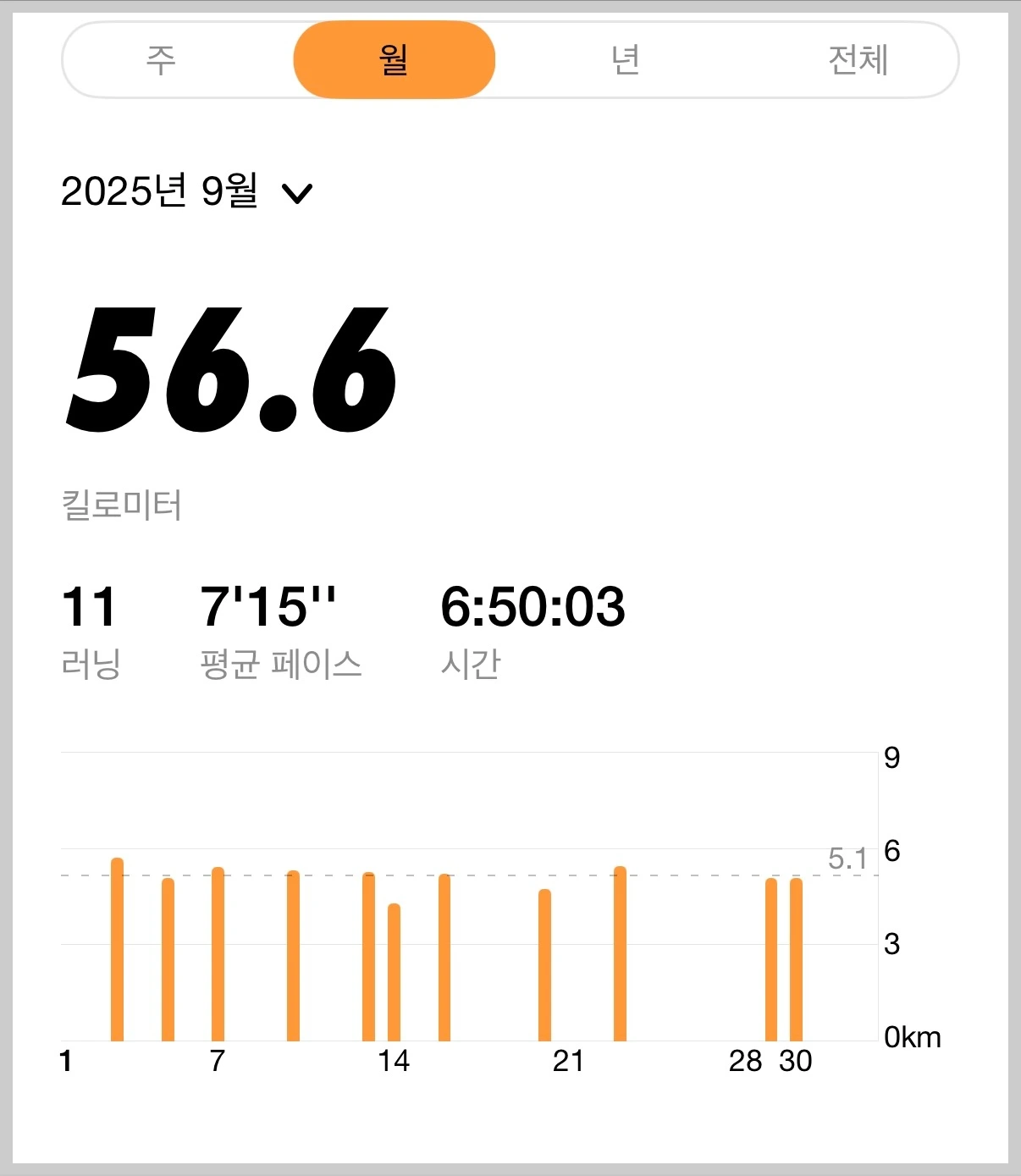 9월 러닝의 평균 페이스는 KM 당 7분 15초, 최장 거리 러닝은 5.70KM, 평균 러닝 거리는 5.14KM였다. 한 번 뛸 때 5KM는 뛰려 노력했고, 11번 중 9번은 5KM 이상을 뛰었다는 점도 스스로에게 칭찬해주고 싶다.
