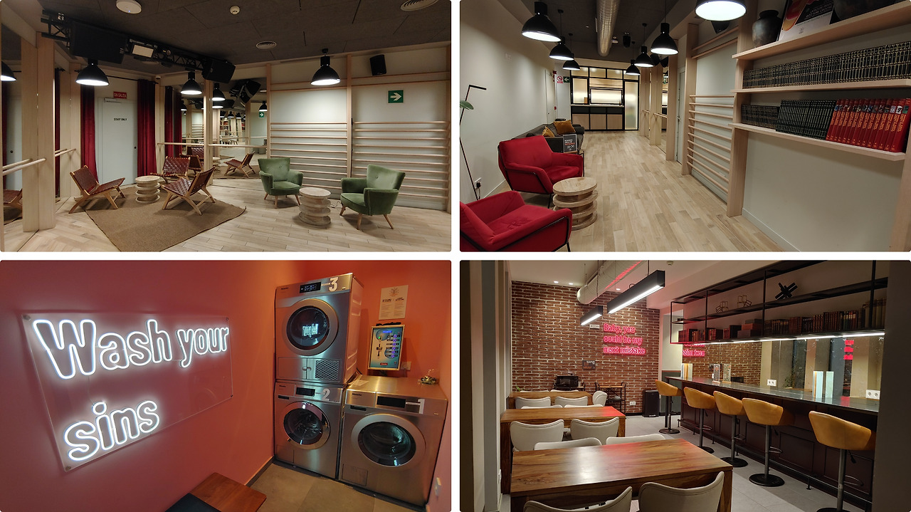 카페 이외에도 0층과 지하 1층에 라운지가 있다. 다른 곳에서 구입한 음식을 먹을 수 있는 공용 주방에는 전자레인지와 식기가 있다. 코인 세탁기도 있어서 별도로 외부의 빨래방을 찾아갈 필요가 없다.
