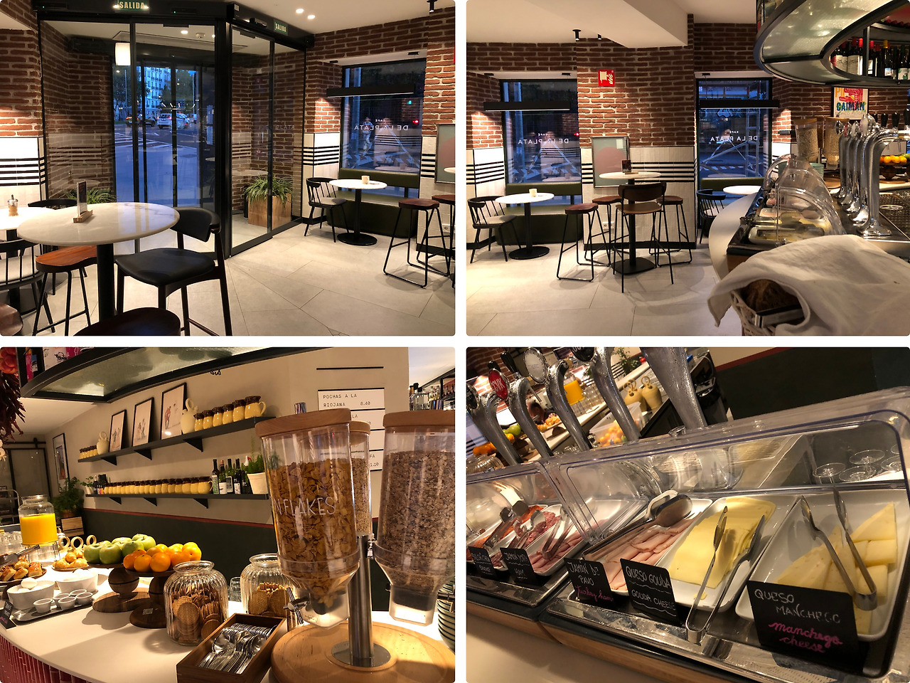 0층(한국의 1층) 리셉션 옆의 카페에서 아침 시간에 조식을 먹을 수 있다. 조식은 유료 옵션으로 추가할 수 있는데 호텔 조식보다는 음식 종류가 적지만 뷔페식으로 가져다 먹을 수 있다. 모든 메뉴의 품질이 좋아서 가성비와 만족도가 높다. 조식 시간 외에는 카페에서 커피와 주류를 판매한다.