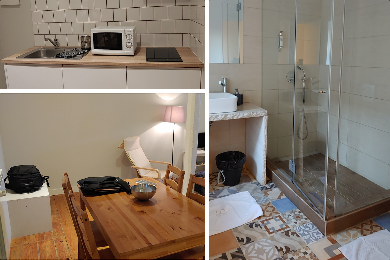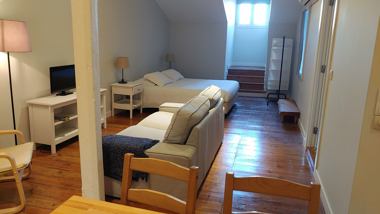 오래된 리스본 주택의 지붕아래 방이다. 작은 싱크대와 식탁 그리고 TV를 볼 수 있는 소파가 있다. 침대까지 이어지는 공간이 넓은 편이다. 욕실은 별도로 분리되어 있는데 바닥의 타일이 이색적이다.