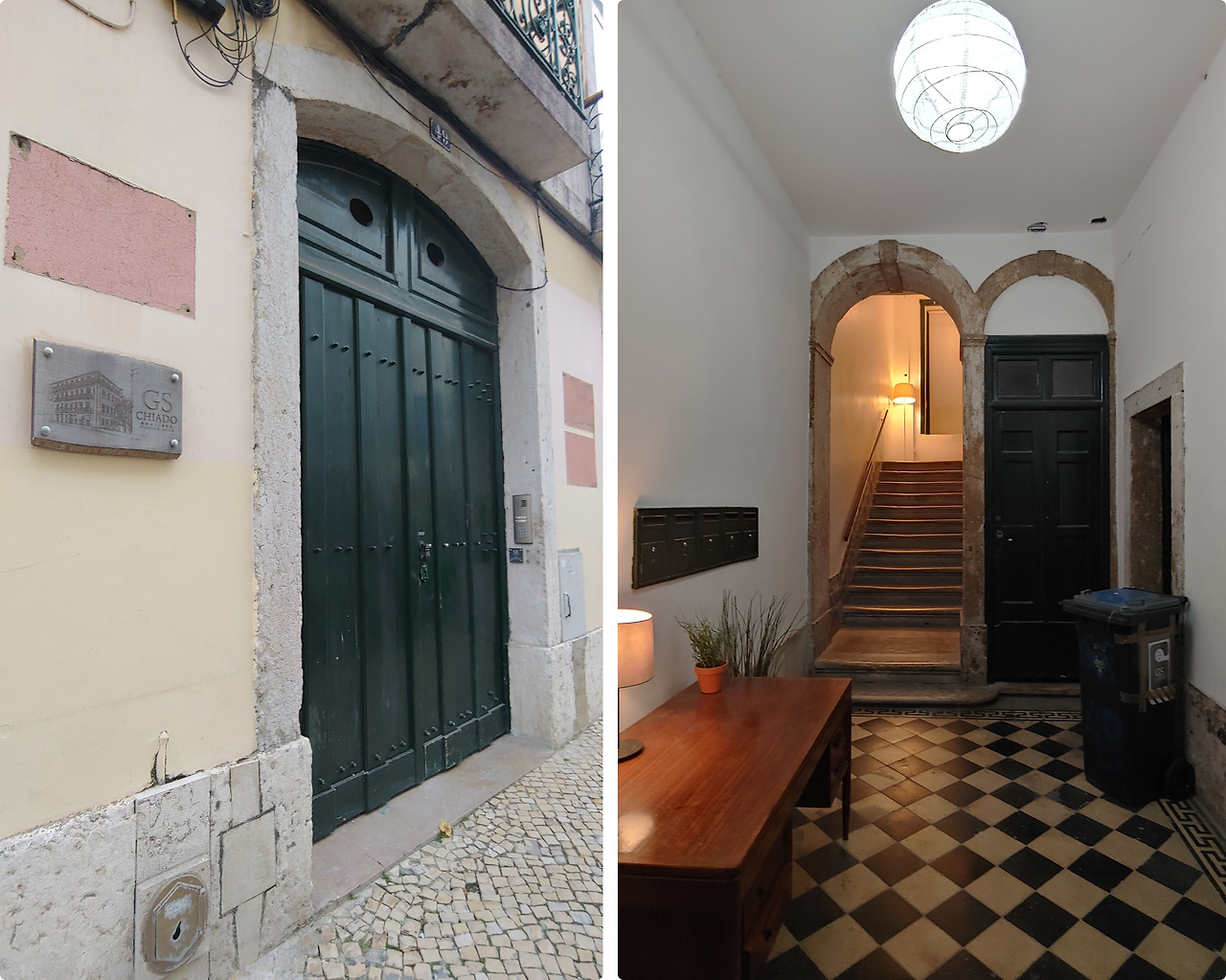 리스본 올드타운 골목 안에 있는 숙소는 작은 문패만 벽에 붙어 있어서 그냥 지나치기 쉽다. 1층 입구부터 흑백의 타일 바닥이 보인다. 엘리베이터가 없어서 앞에 보이는 계단을 계속 올라가야 한다.