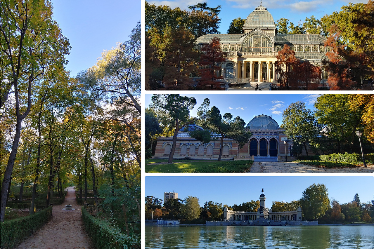 왼쪽 세로 사진부터 시계방향으로 레티로 공원, 크리스털 궁전, 벨라스케스 궁전, 레티로 호수