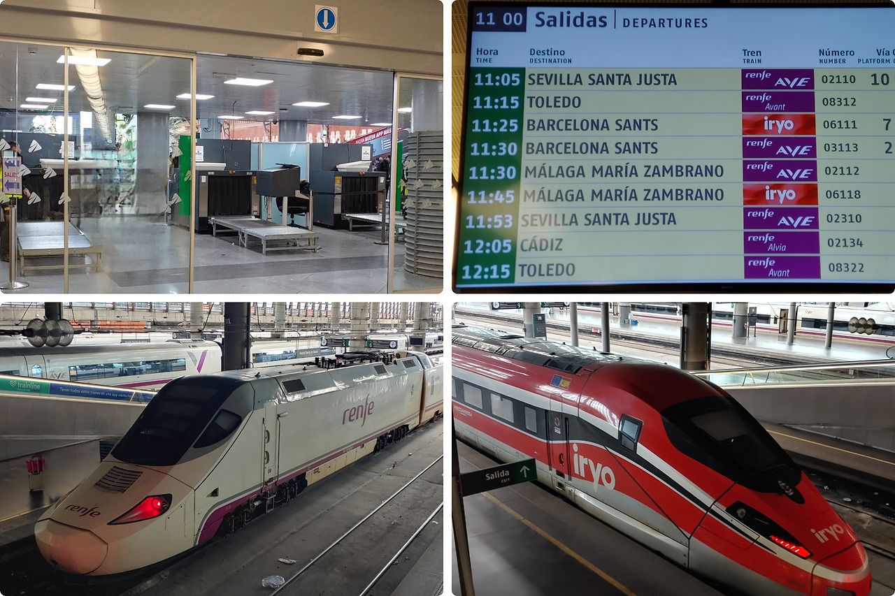 왼쪽 위에서부터 시계방향으로 보안 검색대, 탑승열차 안내 화면, iryo, renfe