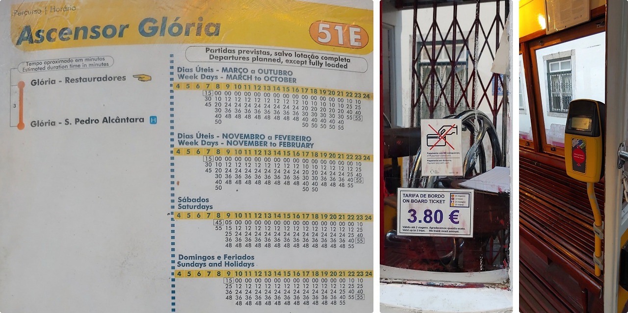 글로리아 엘리베이터는 Glória Restauradores와 Glória S. Pedro Alcântara를 왕복하는 51E 노선의 트램이다. 요일에 따라서 운행하는 시간이 다르다. 평일 8시부터 23시까지 한 시간에 4대에서 6대가 운행한다. 매표소에 왕복 3.80유로이고 카드 결제는 안되며 현금만 가능하다고 붙어있다. 교통카드로 이용이 가능하며 트램 안쪽 노란색 기계에 표를 가져다 대고 타면 된다. 운행 시간 안내문에 있는 Ascensor Glória를 지도앱에서 검색하면 주변의 다른 버스 정류장이 나오므로 주의가 필요하다.