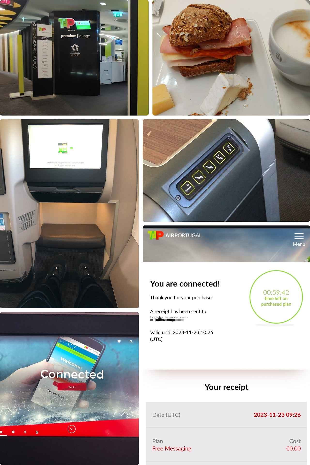 위에서 아래로 포르투갈 TAP 항공(스타얼라이언스) 라운지, 의자를 세우면 발을 뻗어도 앞에 닿지 않고 침대처럼 펼칠 수 있는 좌석, 메시지는 60분간 무료 Wifi 사용 가능
