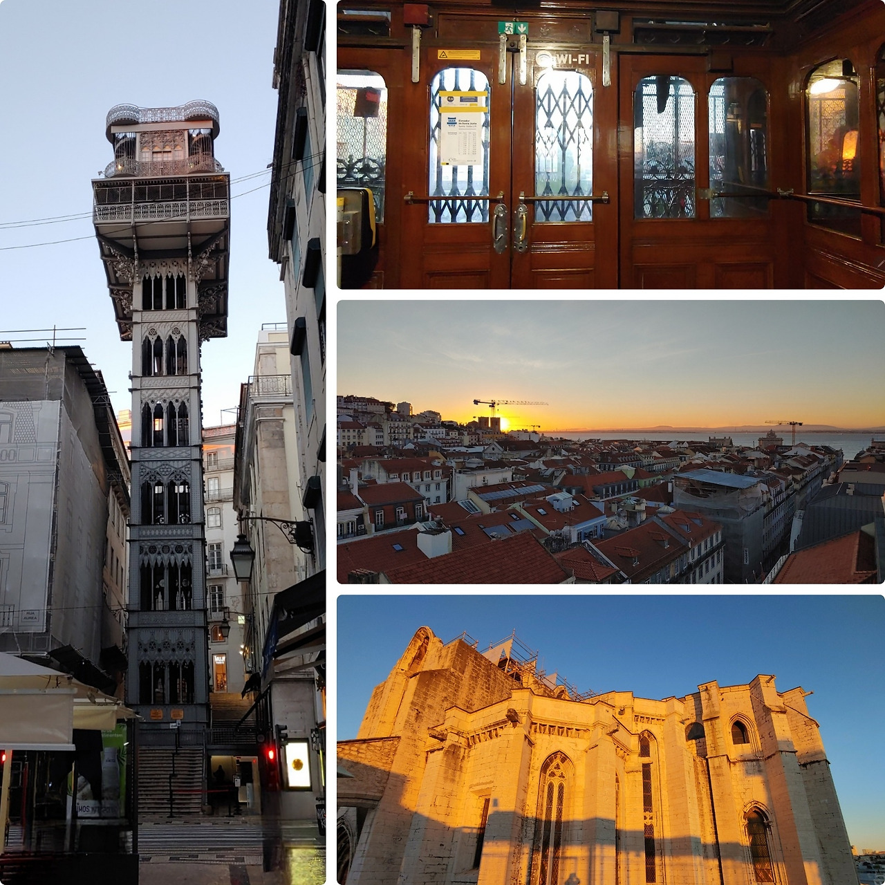 7시 30분에 시간을 맞춰서 산타 후스타 엘리베이터를 타러 갔다. 내가 첫 손님이자 유일한 손님이었다. 가장 위의 전망대까지 포함한 표는 5.3유로였는데 엘리베이터만 타는 것을 전날 구입한 교통카드로 가능했다. 엘리베이터라기보다는 수직으로 오르내리는 정사각형의 방으로 들어간 것 같았다. 올라가는 시간은 몇 분이 채 걸리지 않았다. 엘리베이터에서 내리니 조금 더 위의 전망대까지 올라가지 않아도 도시 전체가 잘 보였다. 리스본의 붉은색 지붕 위로 해가 떠오르고 있었고 반대편의 카르모 수녀원(Museu Arqueológico do Carmo)은 떠오르는 태양에 빛나고 있었다. 어젯밤에 벨렝탑에 가는 길에 본 제로니모스 수도원보다 규모는 작아 보였지만 거대한 성처럼 보이는 것은 비슷했다.리스본의 수도원들은 대성당보다 더 화려해 보였다.