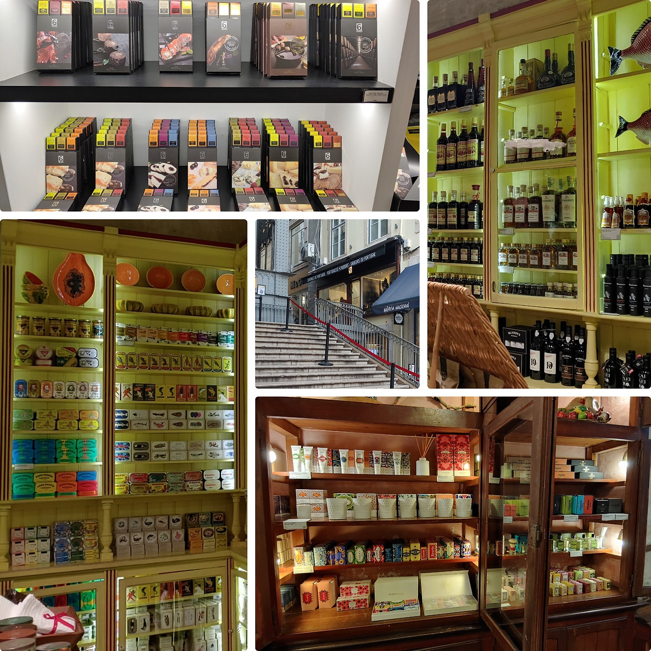 왼쪽 위부터 시계방향으로 메이아두지아 잼, 체리와인, 비누세트, 생선 통조림 (가운데는 산타 후스타 엘리베이터 계단 중간에 있는 메이아두지아 잼 가게 입구)