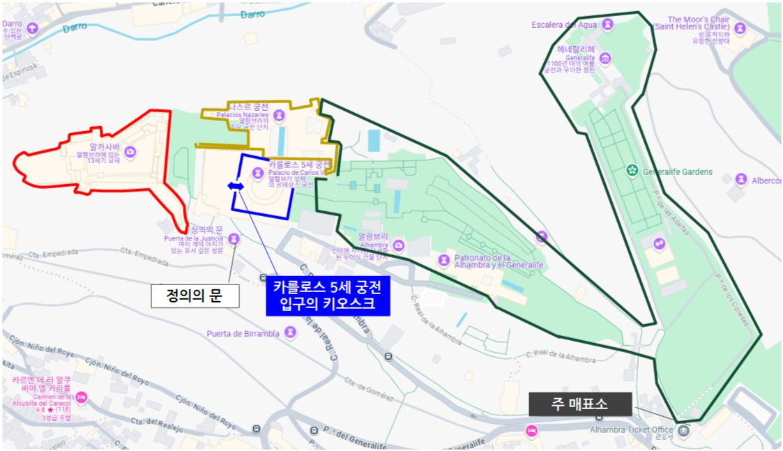 【3】매표소는 구글맵에 알함브라 궁전 입장(Access Pavilion of the Alhambra)으로 검색하면 주매표소가 나온다. 카를로스 5세 궁전(Palacio de Carlos V)의 입구 안쪽에 있는 입장권 판매 기계에서도 입장권 살 수 있다. 카를로스 5세 궁전으로 바로 갈 때는 주매표소가 아니라 정의의 문(Puerta de la justicia) 쪽으로 들어가면 된다.