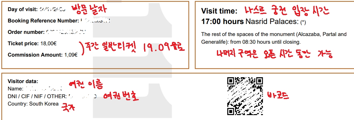 공식 홈페이지에서 구매한 알함브라 입장권에는 방문 날짜와 나스르 궁전 입장 시간이 표시되어 있다. 알카사바, 정원과 헤네랄리페는 는 시작 시간부터 끝나는 시간까지 입장이 가능하다고 나와 있다.