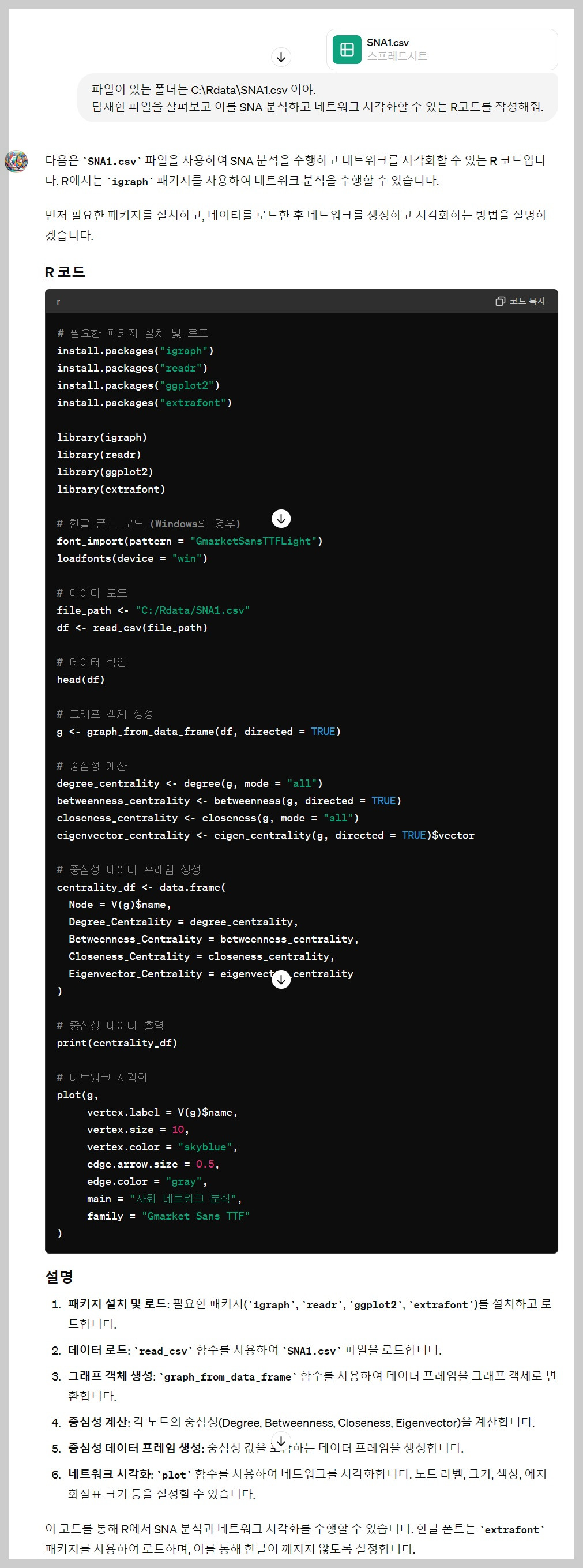 두 번째 방법은 분석하고자 하는 데이터를 ChatGPT에 직접 탑재하고, SNA 분석을 위한 R 코드를 요청하는 것입니다. 이 방법은 보안 이슈가 없어 보다 편리하게 코드를 받고자 할 때 유용합니다.