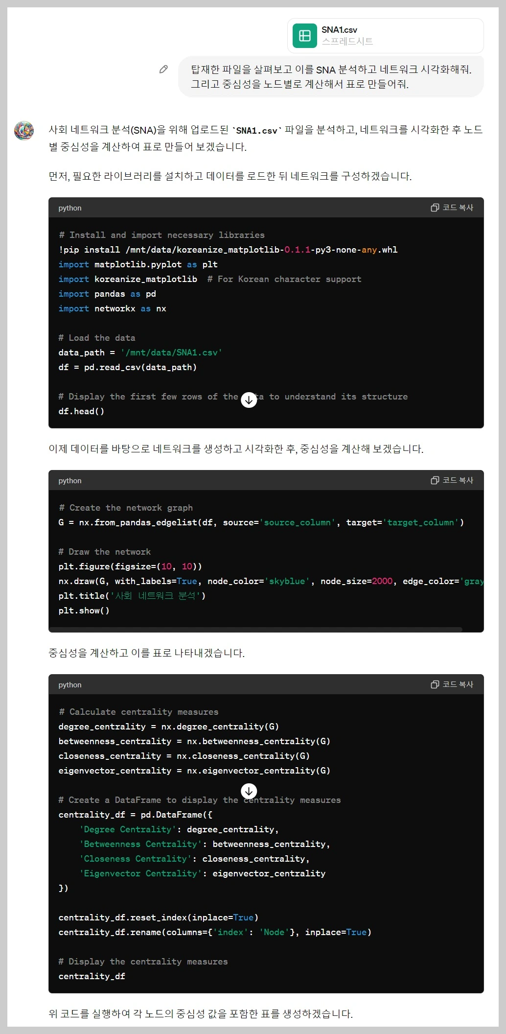 생성된 엣지리스트 파일을 GPTs에 탑재한 후에 '탑재한 파일을 살펴보고 이를 SNA 분석을 실시하고 네트워크를 시각화해줘, 그리고 중심성을 노드별로 계산해서 표로 만들어줘.'라고 요청하였습니다. 그 결과 GPTs는 네트워크 시각화하고 노드의 중심섬을 표로 생성하여 제시해 주었습니다.