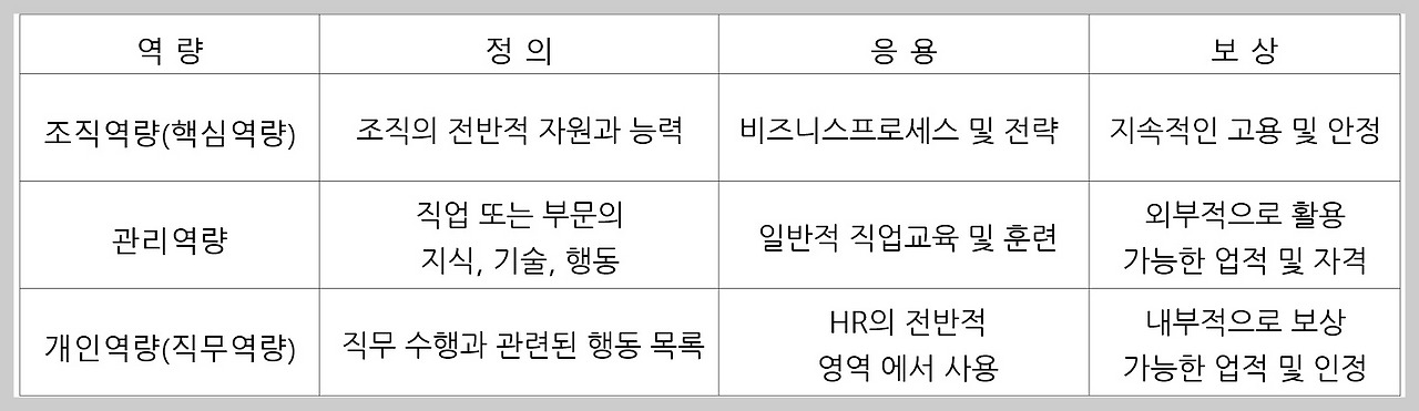 Sparrow(1996)는 역량을 조직역량(핵심역량), 관리역량, 개인역량(직무역량)으로 구분하였습니다. 조직역량(핵심역량)은 조직 내 구성원들이 공유해야 하는 역량을 의미하며, 관리역량은 조직에 상관없이 일반적으로 적용가능한 지식, 기술, 행동 등을 의미합니다. 마지막으로 개인역량(직무역량)은 개인 차원의 직무 수행과 관련된 역량을 의미합니다(신병대, 2019).