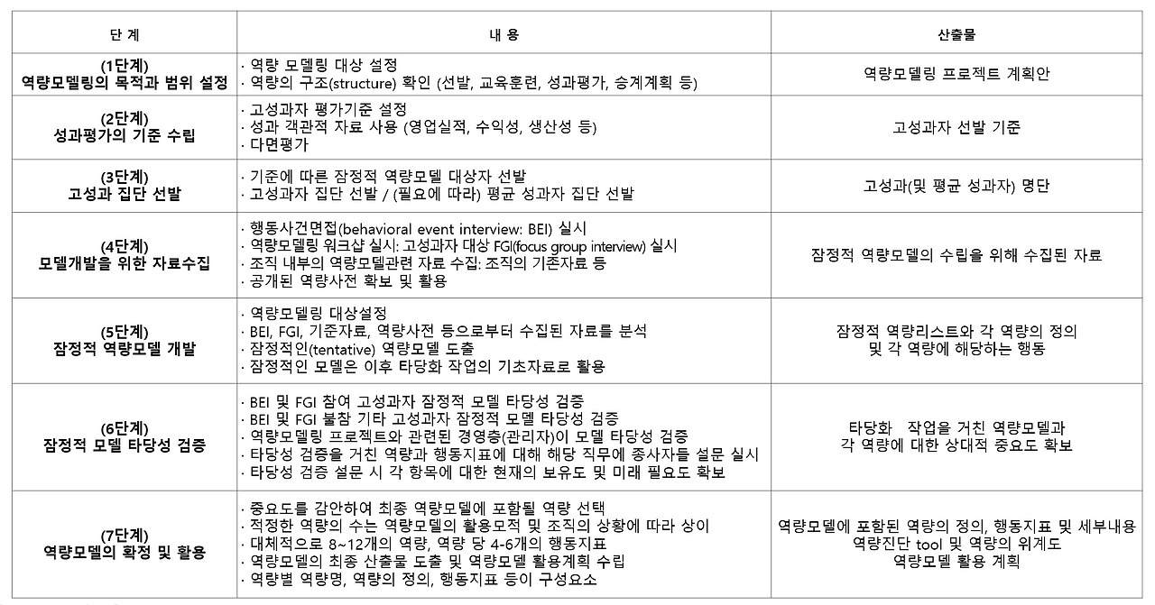 역량모델링은 조직목적을 달성하기 위한 직무(또는 직무군)에 결정적으로 영향을 주는 역량을 정의하고 체계화하는 과정입니다. 즉, 조직이 목표를 달성하고 조직 성과를 극대화하기 위해 필요한 지식, 기술, 태도, 지적 전략 등을 포함하는 역량을 체계화하고 이를 구체화하는 과정입니다(박용호, 2017). 역량모델을 도출하기 위해서는 역량모델링이 필수적이며 아래 표와 같이 단계별 역량모델링 프로세스를 실시하여야 합니다. 역량모델링 프로세스는 총 7단계이며 아래 표에서 살펴볼 수 있는 바와 같이 1단계 '모델링 목적과 범위 설정', 2단계 '성과평가의 기준 수립', 3단계 '고성과 집단 선발', 4단계 '모델 개발을 위한 자료 수집', 5단계 '잠정적 역량 모델 개발', 6단계 '잠정적 모델 타당성 검증', 7단계 '역량모델의 확정 및 활용'으로 구성되어 있습니다.