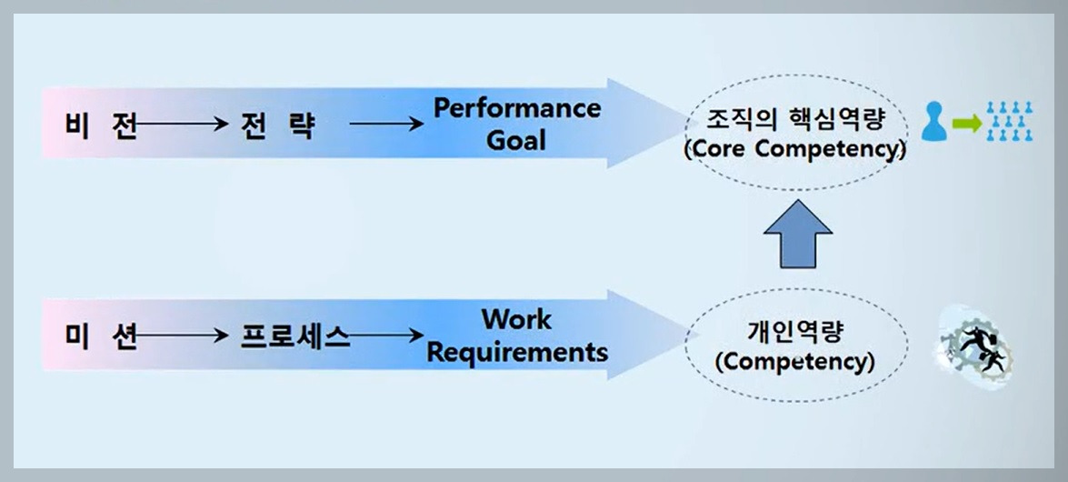 개인역량(직무역량)과 조직역량이 서로 다른 개념이긴 하지만 개인역량(직무역량)과 조직역량은 서로 중복되는 지점을 가지고 있습니다. 따라서 개인역량(직무역량)과 조직의 핵심역량을 각각 개발하는 것도 중요하지만 조직의 핵심역량과 연계된 개인역량(직무역량)을 파악하고 유기적으로 강화는 것 또한 전략적으로 매우 중요합니다. 이와 같은 이유로 많은 조직들이 직무·직군의 공통 역량을 파악하는 동시에 조직의 핵심역량을 함께 설정하여 양자를 통합하는 역량모델을 구축합니다. 이와 같이 개인역량(직무역량)과 조직의 핵심역량을 연계하여 수행하는 인적자원관리가 바로 역량 중심의 인적자원관리입니다(박우성, 2002).