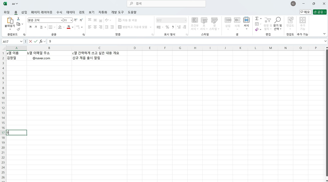 - a열 '이름', b열 '이메일 주소', c열 '간략하게 쓰고 싶은 내용 개요'에 대한 설명을 메인 화면에 표시해 줘