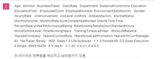 [참고] IBM HR Data 외 민감한 데이터를 탑재로 인해 개인정보 혹은 보안상 문제가 생길 것으로 우려되는 경우에는 아래와 같이 CSV 파일 내용 중 1행(열 제목)과, 2행(첫번째 데이터)만 넣고, 데이터 전체 형태를 설명해줘도 수행 가능합니다.