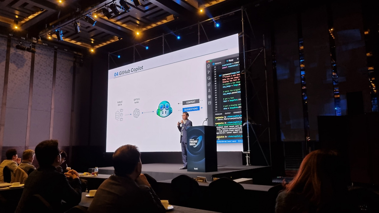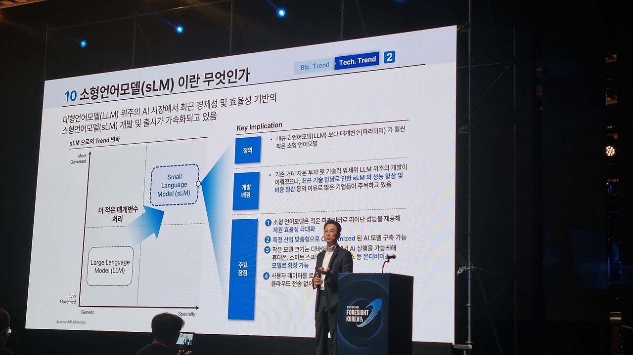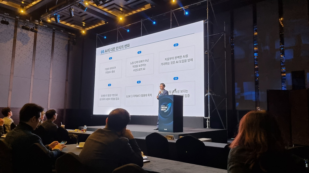 김명구 부사장님의 "Global AI 동향과 미래 맞춤형 AI 전략" 강연은 최신 AI 기술 트렌드와 기업 도입 전략에 대해 인사이트를 주는 강연이었습니다. 특히 '수직적 AI', 'Multi-Modal AI', '소형 언어 모델(sLM)'의 발전이 다양한 산업군에서 어떻게 활용되고 있는지를 설명하며, 이러한 기술이 기업 전략 수립에 핵심적 요소가 될 것임을 강조했습니다. AI 기술이 단순히 발전하는 것이 아니라, 각 산업의 특성에 맞춘 맞춤형 솔루션 개발로 기업 운영 효율을 높이는 방향으로 나아가고 있다는 점이 인상적이었습니다.