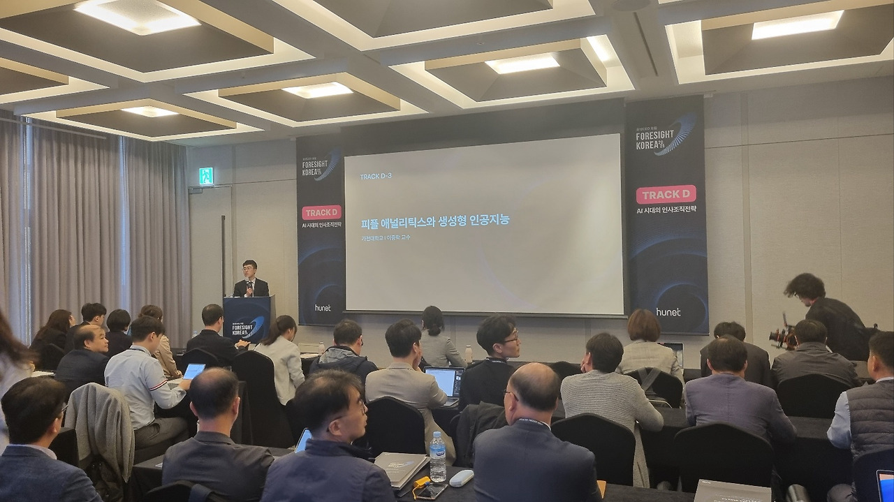 피플 애널리틱스 분야의 명사로 이쪽 분야에 관심 있는 분이라면 누구나 아는 가천대 이중학 교수님의 '피플 애널리틱스와 생성형 인공지능' 강연에 참석했습니다. 교수님은 AI 기술과 데이터 분석이 가져올 변화를 깊이 있게 다루며, 청중들의 관심을 사로잡았습니다.