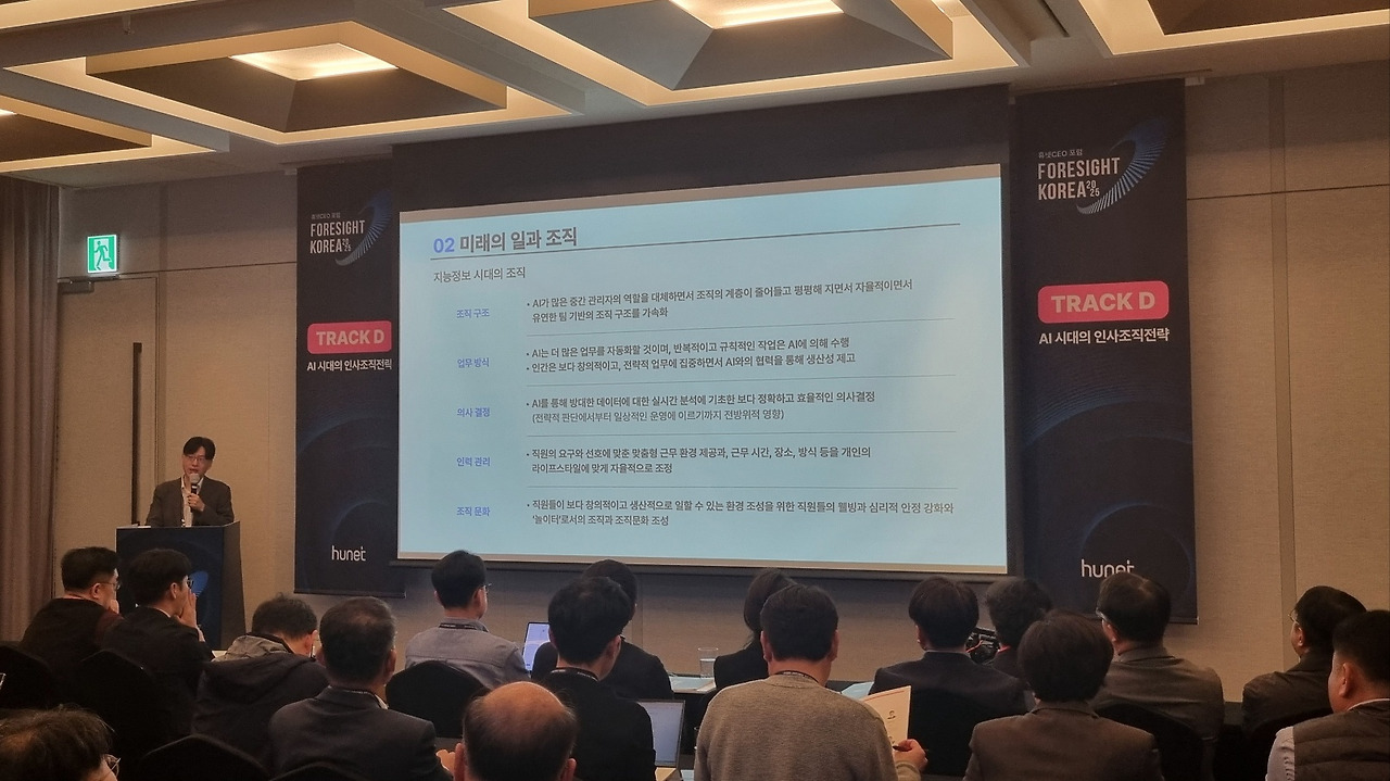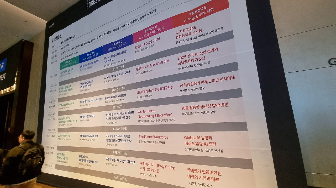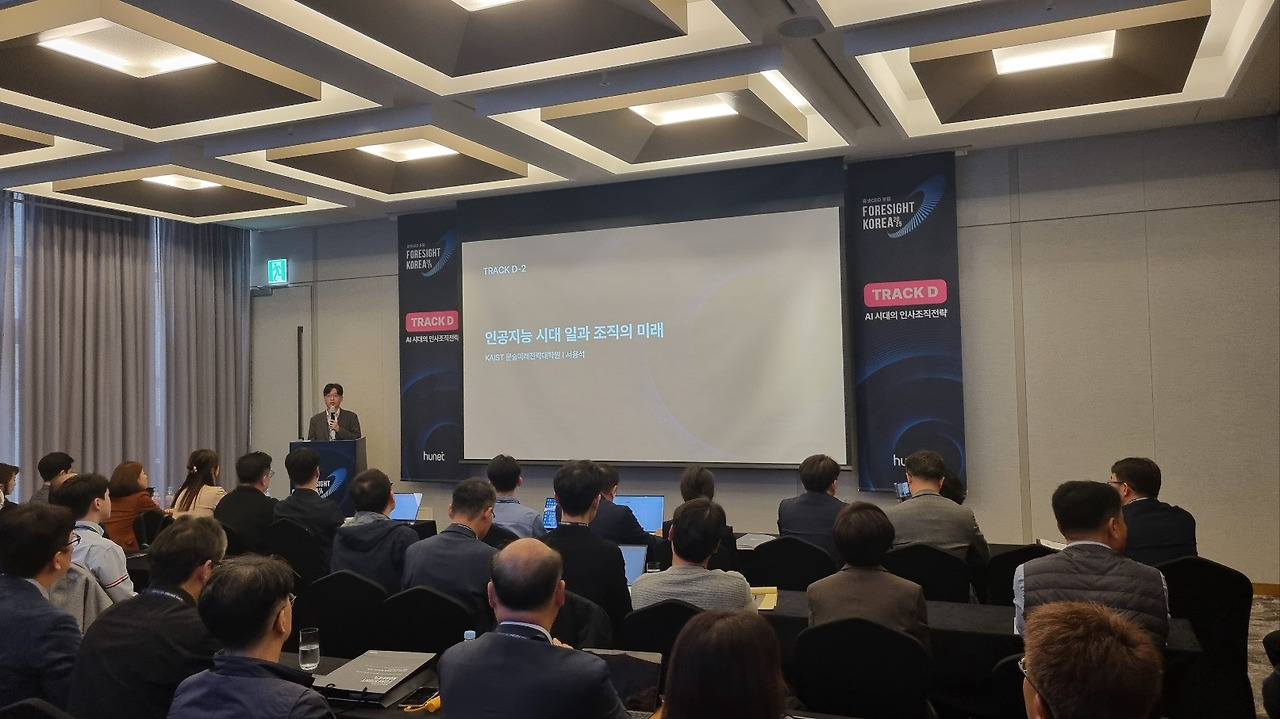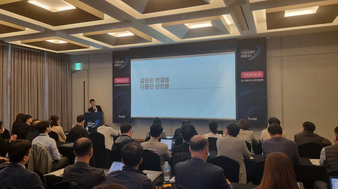 2024년 10월 16일에는 휴넷이 주최한 'FORESIGHT KOREA 2025 컨퍼런스'에 참석하였습니다. 컨퍼런스의 다양한 강연 통해 미래 경영 환경과 전략에 대한 소중한 인사이트를 얻을 수 있었습니다. 서울대 송재용 석학교수님의 기조강연 후, 국내 최고의 전문가들이 모여 5개의 섹션으로 컨퍼런스가 진행되었습니다. 섹션은 Track A '2025년 경제 전망과 기회', Track B 'VUCA시대의 경영전략' Track C '미래 소비 트렌드 예측', Track D 'AI 시대의 인사조직 전략', Track E' AI 혁명과 미래 경영'으로 각각 진행되었습니다. 저는 주된 관심사가 HR과 AI이기 때문에 Track D, Track E를 중점적으로 참여하였습니다. 이번 글에서는 이 컨퍼런스를 통해 얻은 주요인사이트를 정리하고 공유해보고자 합니다.