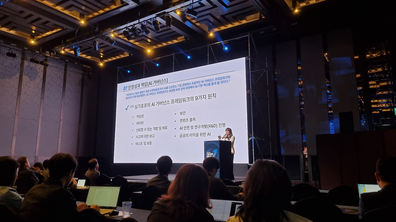 둘째, AI 대전환 시대의 8가지 핵심 키워드를 제시했습니다. '멀티모달 AI', '환각', '온디바이스 AI', 'AI 에이전트', '오픈소스 AI 생태계', 'AI의 지속가능성 강화', '안전성과 책임(AI 거버넌스)', '소버린(Sovereign) AI' 등의 키워드를 통해 기업들이 주목해야 할 AI 관련 트렌드를 소개했습니다.