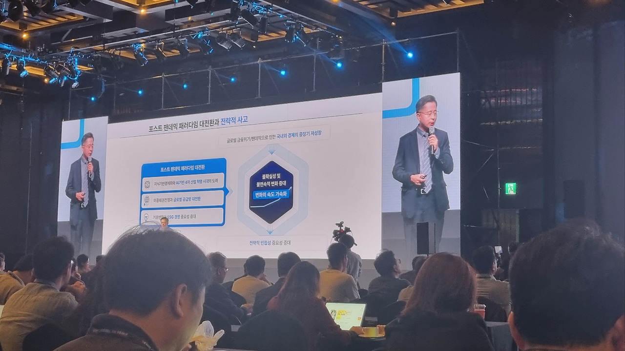 서울대 송재용 석학교수님의 기조강연으로 컨퍼런스의 막이 올랐습니다. 50분간 진행된 이 강연은 기업이 2025년 사업전략 수립 시 고려해야 할 5대 패러다임 변화를 집중적으로 다루었습니다. AI 혁명, 글로벌 경기 둔화, 지정학적 리스크, 글로벌 공급망 재편, 그리고 불확실성 대응 전략이 주요 주제였으며, 교수님은 각 분야의 글로벌 트렌드를 분석하고 한국 기업의 대응 방안을 제시했습니다.