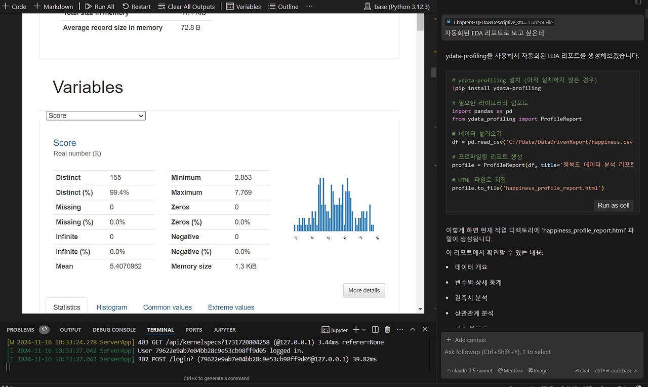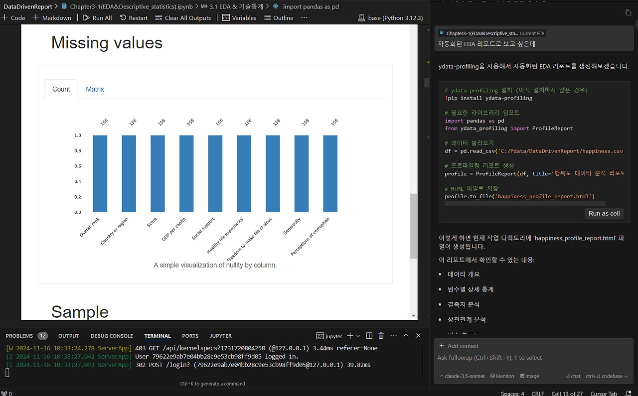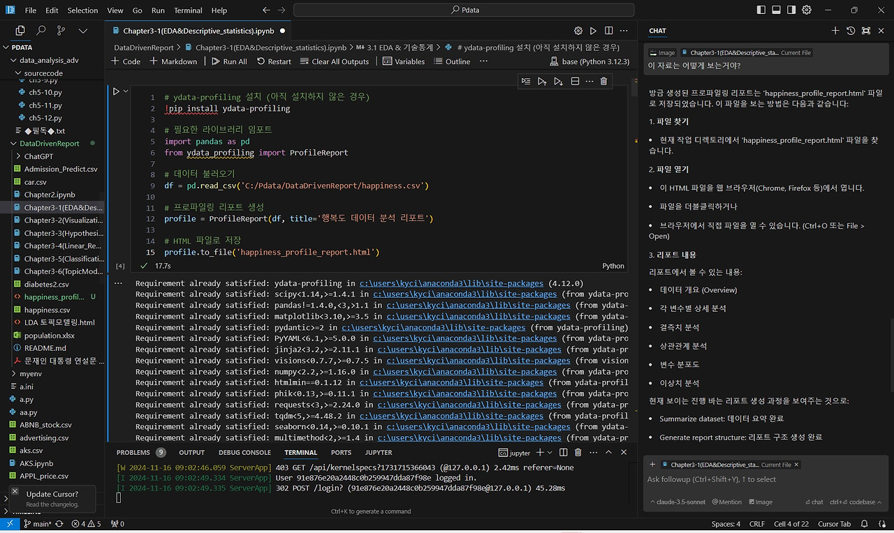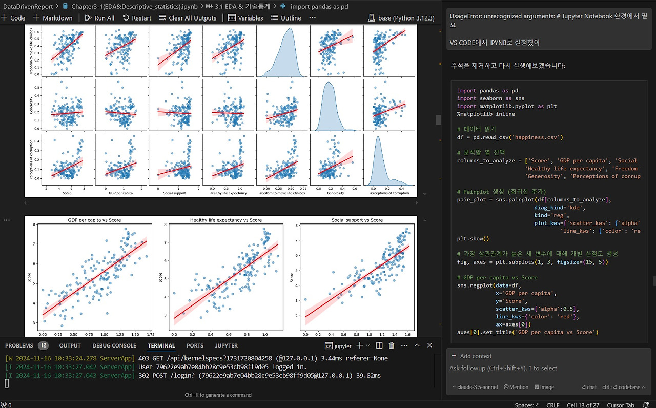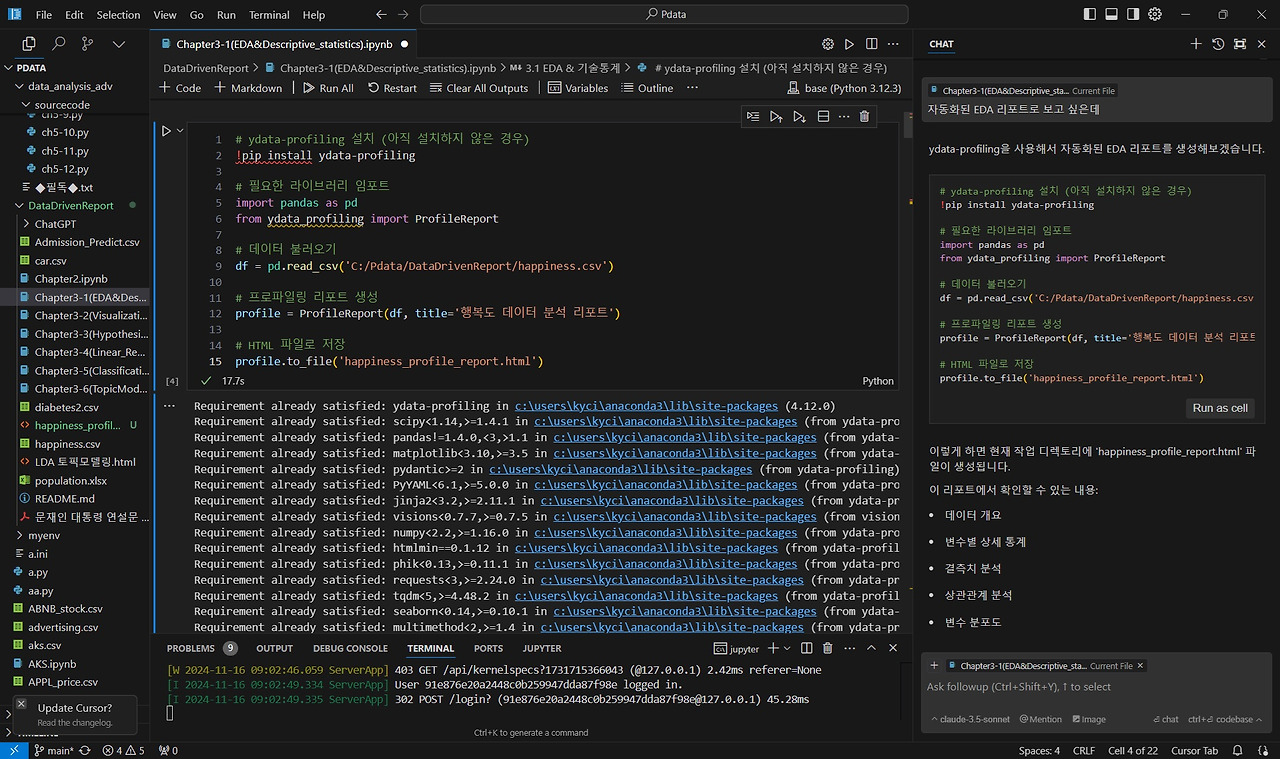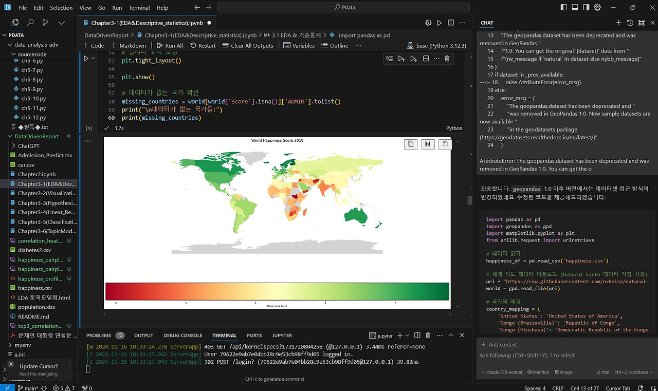 자동화된 EDA 프로그램 외에도 Cursor AI와 직접 대화하며 변수 간 상관관계 분석, 세계 지도상 국가별 행복지수 표시 등 다양한 데이터 시각화를 진행할 수 있습니다.